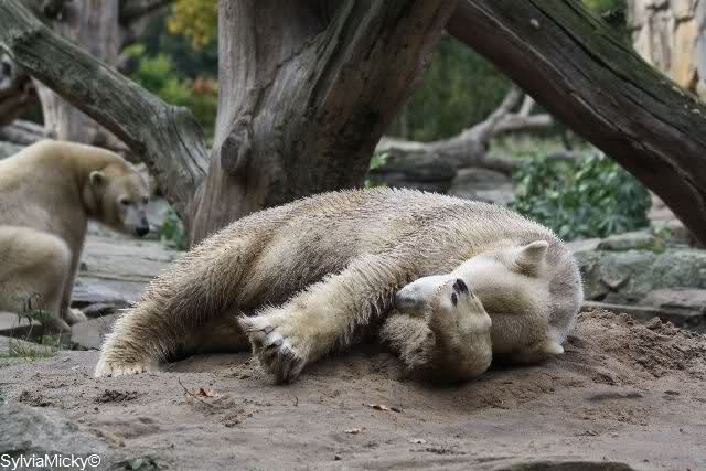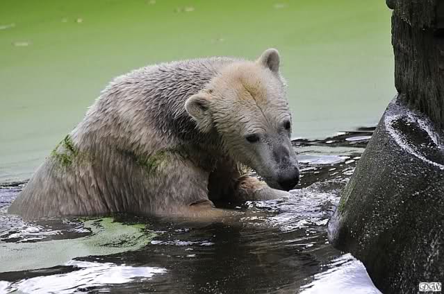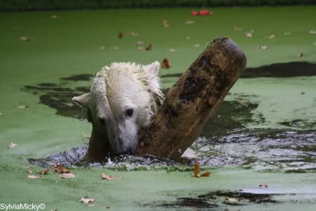 Am Nachmittag schaute sie zwar immer nach Knut aber ging nicht hin. Sie machte heute auch einen ruhigen Eindruck. Am Nachmittag spielte Knut mit dem Baumstamm im Wasser. Neugierig beäugt von Gianna von oben.