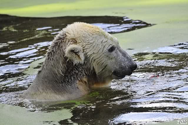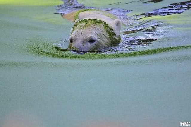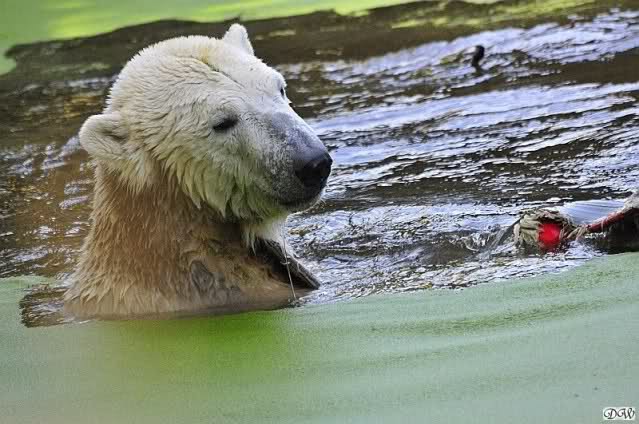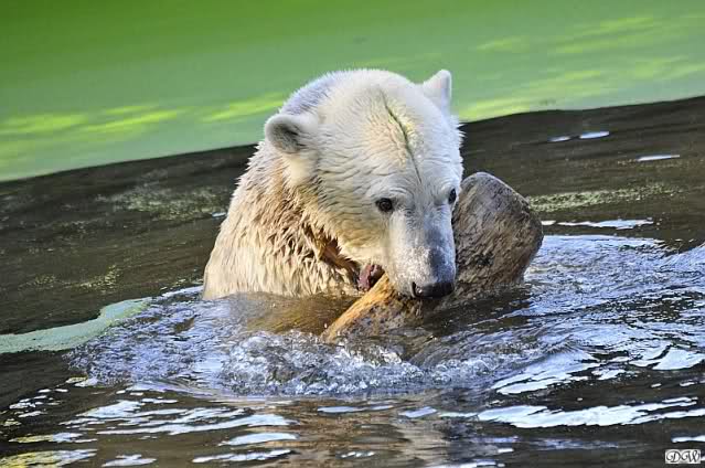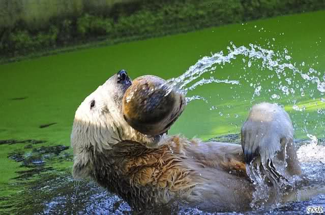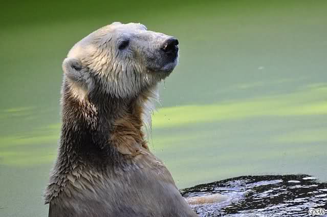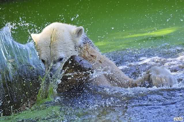 Ursula_Spenke: Welch erfreulicher Anblick, Knuti ist wieder im Wasser und spielt. Seine großen schönen Knopfaugen schauen auch wieder glücklich ... ach sorry - ich vergass - ein gefährlicher Eisbär schaut grimmig.
