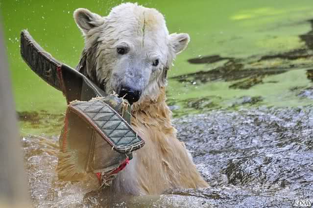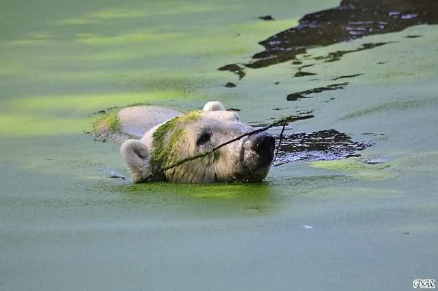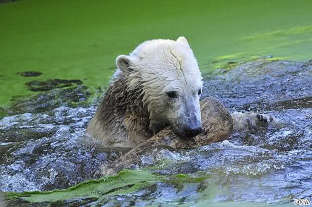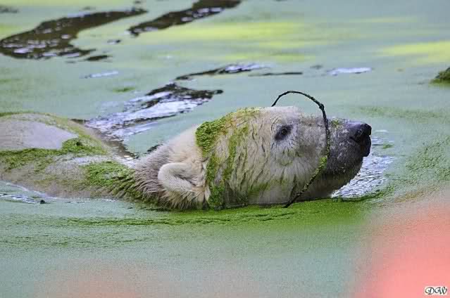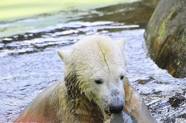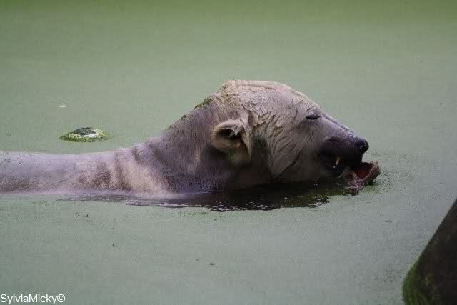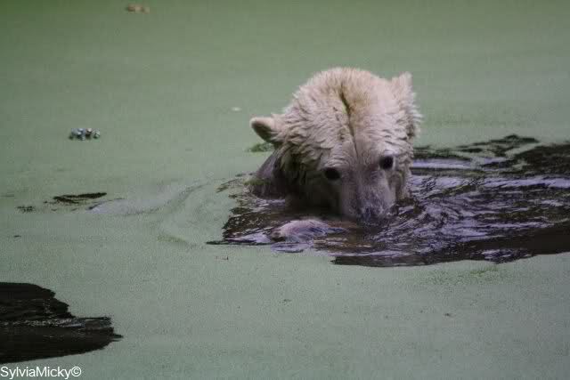 Welch erfreulicher Anblick, Knuti ist wieder im Wasser und spielt. Seine großen schönen Knopfaugen schauen auch wieder glücklich ... ach sorry - ich vergass - ein gefährlicher Eisbär schaut grimmig.