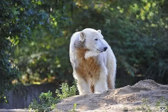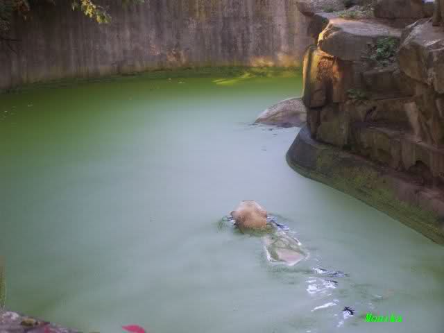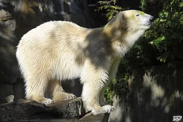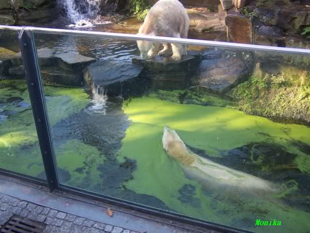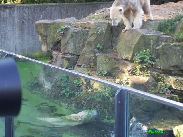 Das war heute Morgen schon eine Riesenüberraschung. Knut und Gianna gemeinsam im Wasser. Als Knut in der linken Kurve im Wasser wie angewurzelt saß, kam Gianna lässig um die Ecke geschwommen. Knut brachte sich dann doch in "Sicherheit" nach oben. Es war schon schön anzusehen, wie nahe sich die Beiden heute kamen. Gianna gab sich ganz cool und ging immer wieder auf Knut zu, der ein paarmal etwas schnaufte und dabei 3 Schritte zurück lief. Er wurde nur etwas mutiger, als Gianna ihm den Rücken zudrehte. Gianna drehte immer wieder ganz ruhig ihre Runden im Wasser und Knut schaute von oben zu. Ab und zu sah es so aus, als wolle er auch ins Wasser, aber sobald Gianne in Sicht war, machte er wieder einen Rückzieher.
