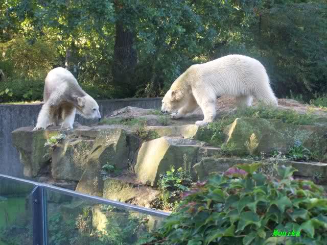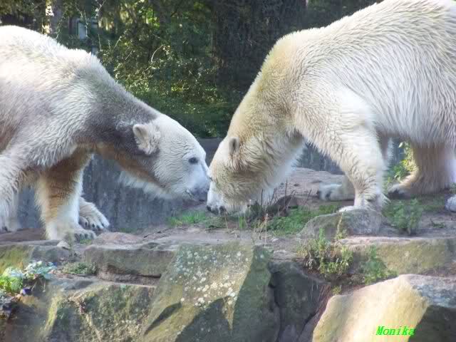 Lieber Hartmuth, liebe Sylvia, Monika. liebe Live-Berichterstatter und Fotografen/innen, danke für die aktuellen Meldungen, schneller als jede Abendschau. Ist das spannend, wie sich beide Eisbären miteinander bekanntmachen und hoffentlich allmählich befreunden. Ich bin mir sicher, das ist der Anfang einer wunderbaren Freundschaft, ach wenn Herr Dörflein das noch miterlebt hätte! Aber gut, dass Herr Henkel und das gesamte Bärenteam alles im Auge haben und sofort reagieren, so dass die Annäherung behutsam erfolgen kann. Wie hat Herr Dörflein auf die Frage wie er die Zukunft von Knut sehe, geantwortet: Na rosig!