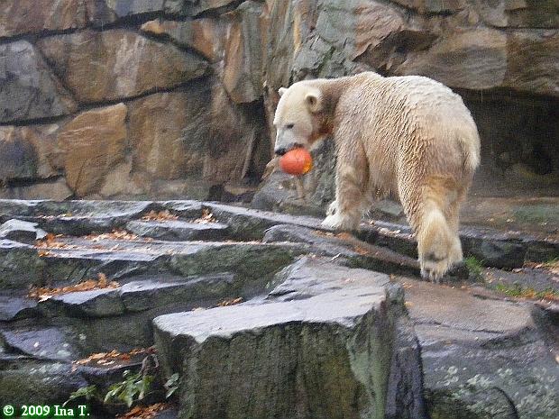 Tja, und dann natürlich der Kürbis! Knut hatte schon ein ganzes Stück verspeist als Gianna kam. Knut trug den Kürbis nach oben, und direkt vor Giannas Pfoten viel die Hälfte des Kürbisses runter. So bekam jeder einen Teil. Nach dem Essen legte sich Gianna wieder unter den Baum und beobachtete Jürgen, der auf dem Baum Verrenkungen machte. Knut ging ins Wasser, fischte noch ein paar Möhren und spielte dann gut eine halbe Stunde ausgelassen mit einem Ball und sein Nackthuhn. Es war schön zu sehen, dass er endlich mal wieder gespielt hat. Da die Lichtverhältnisse nicht mehr so toll waren, gibt es leider davon keine Fotos.