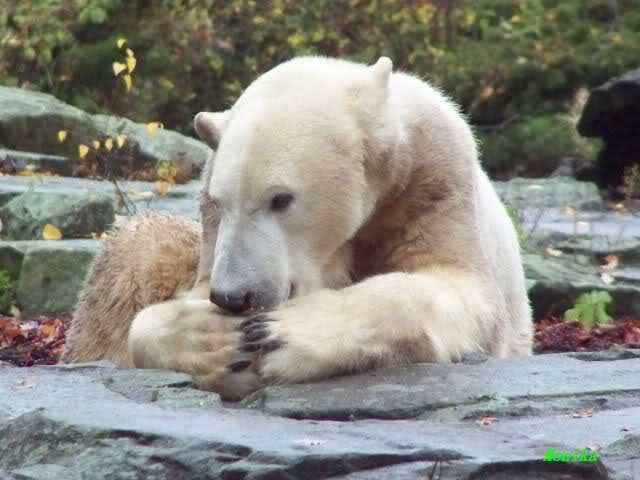 Allerdings, wenn ich den ausführlichen Bericht von Nanni aus dem Wuppertaler Zoo über Knuts Papa Lars lese, dann ist es nichts Außergewöhnliches, diese Tapirlippe. Denn auch Papa Lars fing sich eine *Backpfeife* ein und macht nun ab und zu die Tapirlippe. Das ist wohl die Sprache der Eisbären