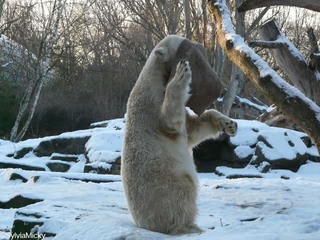 Er stellte sich auf und machte "Männchen", dabei hatte er doch zeitweise Schwierigkeiten auf dem Eis nicht weg zu rutschen! Später streckte er sich wieder, um die ins Wasser gefallenen Leckereien rauszufischen, ohne dabei wirklich nass zu werden. So, nun wollte Knut "nach oben" klettern, er versuchte es 5x bei seinem Lieblingsaufstieg, dort wo sonst der kleinen Wasserfall läuft, doch er drehte jedesmal um, nachdem er mit seinen Tatzen die Glätte überprüft hatte...