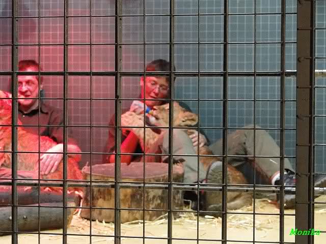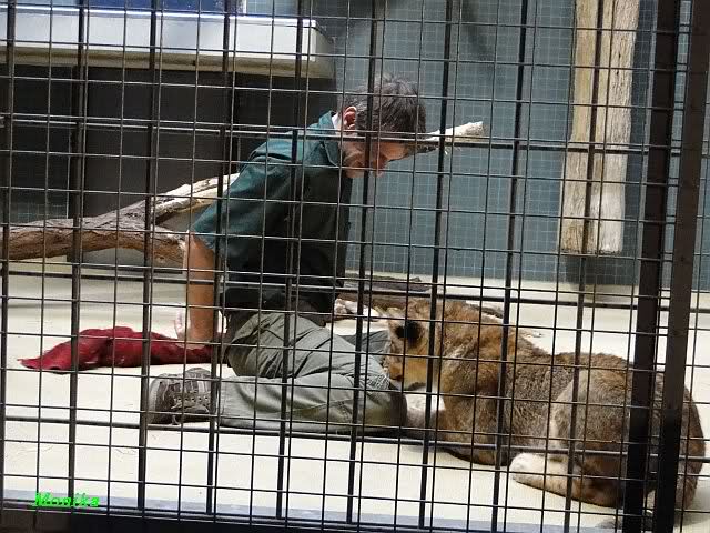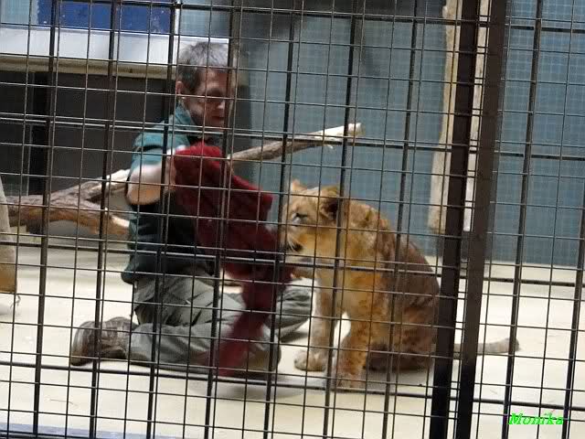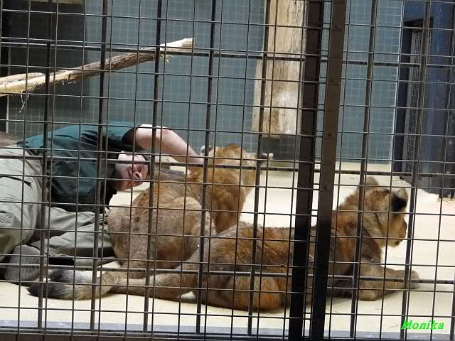 Obwohl die Löwenkinder schon mächtig gewachsen sind, bekommen sie noch die Flasche. Und Spielrunden mit den Pflegern finden auch noch statt. Heute spielten sie unter anderem mit einer Kokosnuss. Die Pfleger rollten sie von einem Käfig zum anderen hin und her. Ich hatte manchmal den Eindruck, dass die Pfleger fast mehr Spaß an dem Spiel hatten als die Löwen.