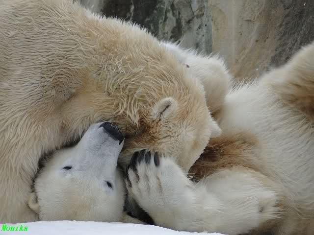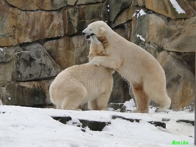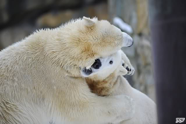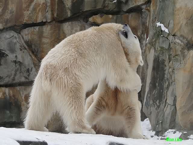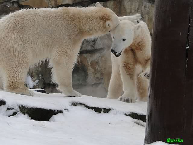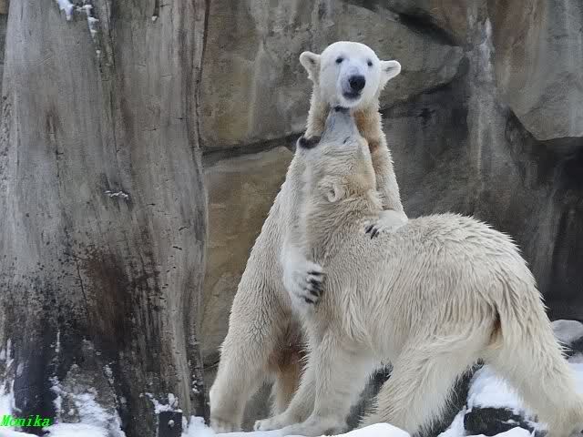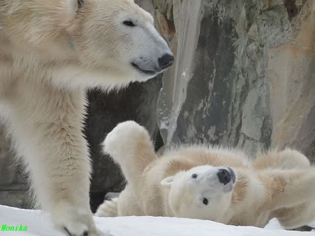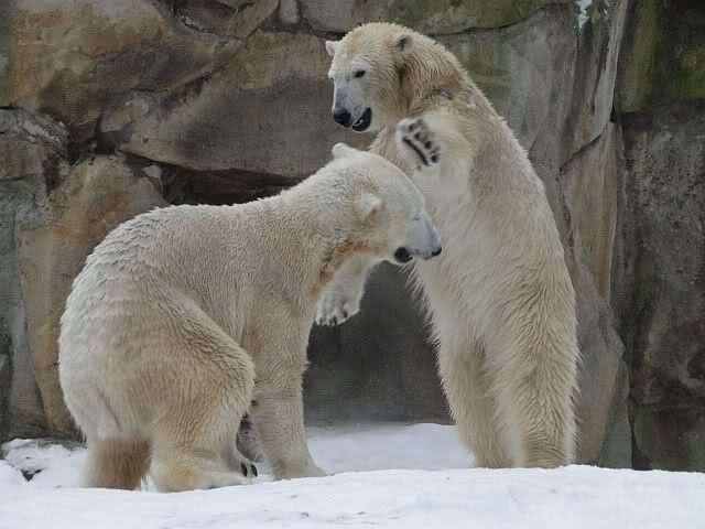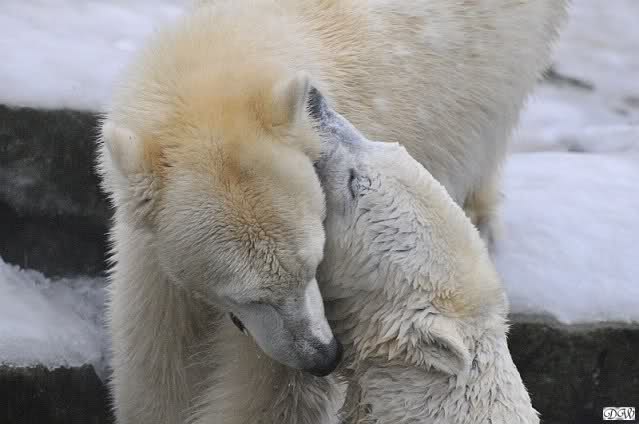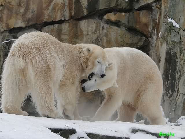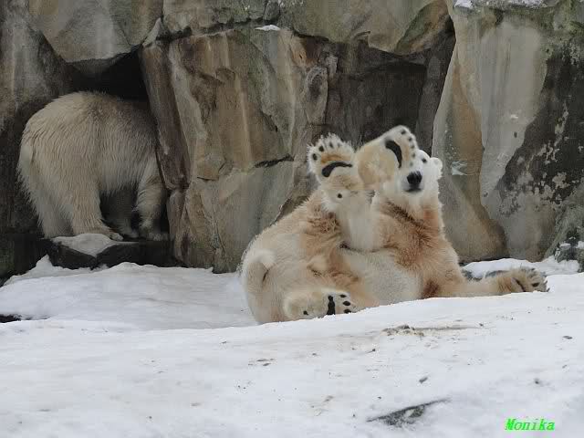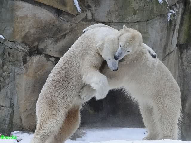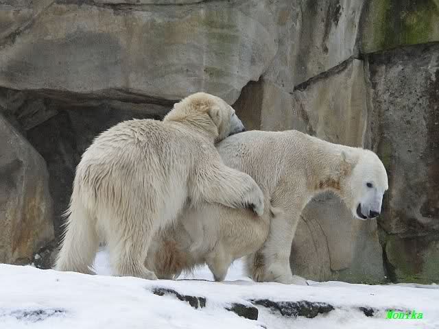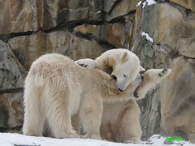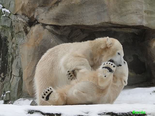Trotzdem traf ich kurz nach zehn wohlbehalten im Zoo ein. Im Zoo war es heute wunderschön, es waren kaum Leute da. Vor Knuts Gehege standen lediglich drei Stammbesucher. Knut und Gianna störte das nicht im Geringsten. Sie waren zusammen im Wasser und spielten und tobten wunderschön. Sie hatten einander umarmt und rangelten wie ein verliebtes Pärchen im Übermut. Ich sah ihnen ein Weilchen zu. Dann ging ich zur Fütterung der großen Eisbären.