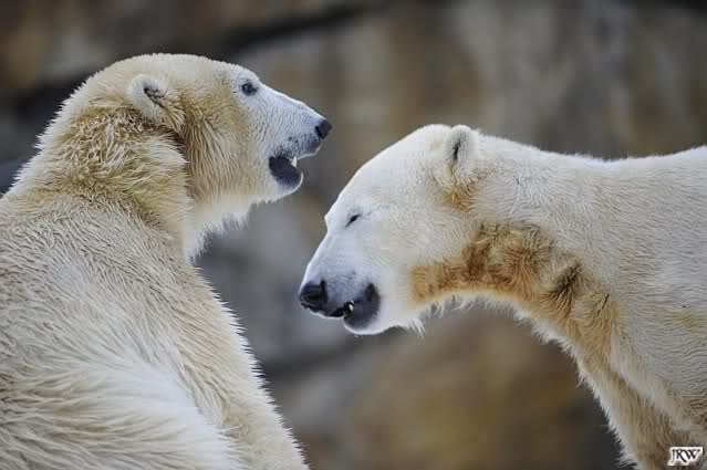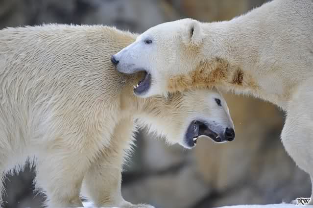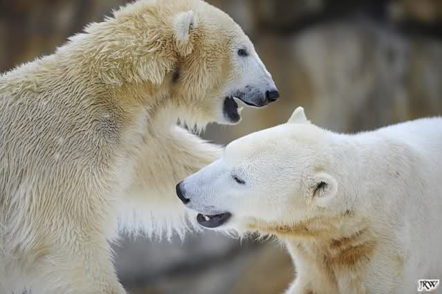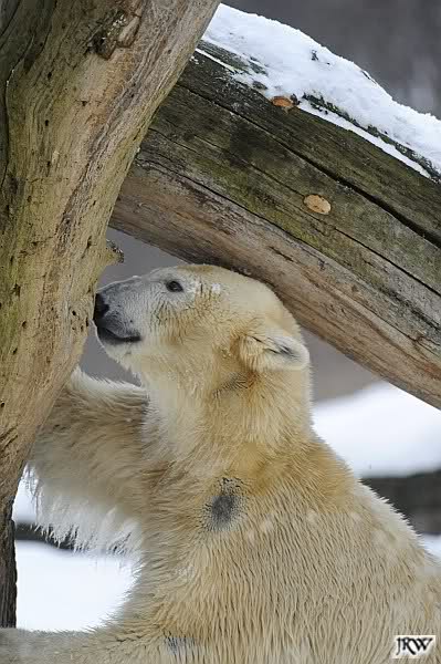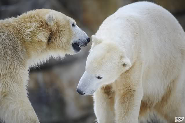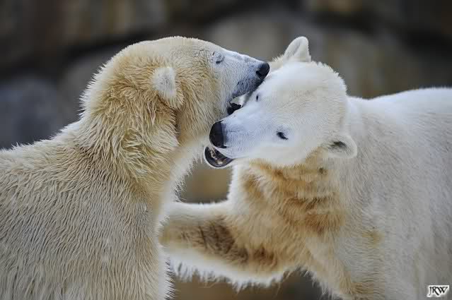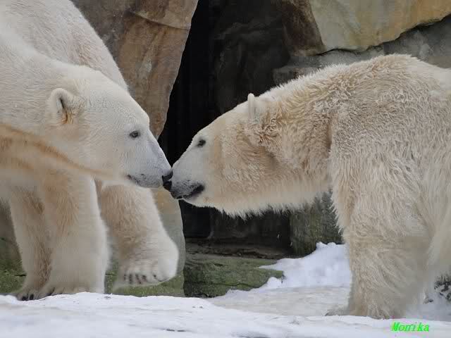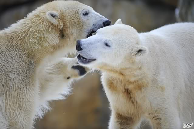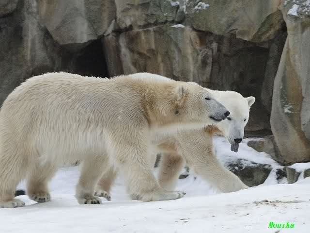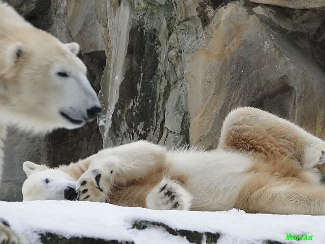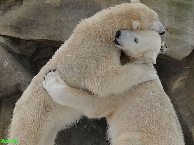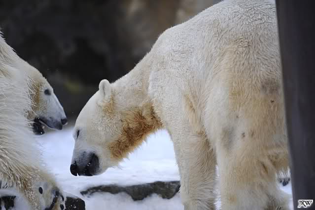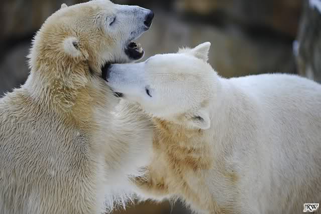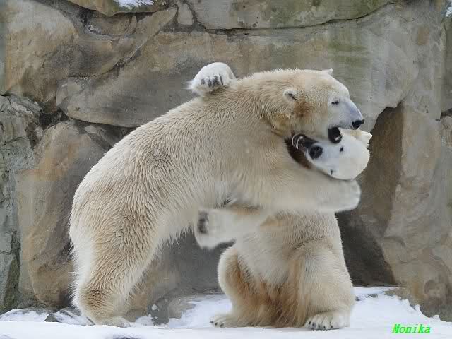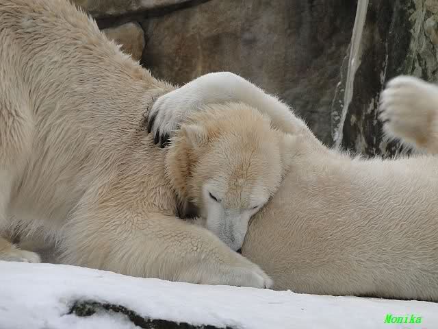 Trotzdem traf ich kurz nach zehn wohlbehalten im Zoo ein. Im Zoo war es heute wunderschön, es waren kaum Leute da. Vor Knuts Gehege standen lediglich drei Stammbesucher. Knut und Gianna störte das nicht im Geringsten. Sie waren zusammen im Wasser und spielten und tobten wunderschön. Sie hatten einander umarmt und rangelten wie ein verliebtes Pärchen im Übermut. Ich sah ihnen ein Weilchen zu. Dann ging ich zur Fütterung der großen Eisbären.