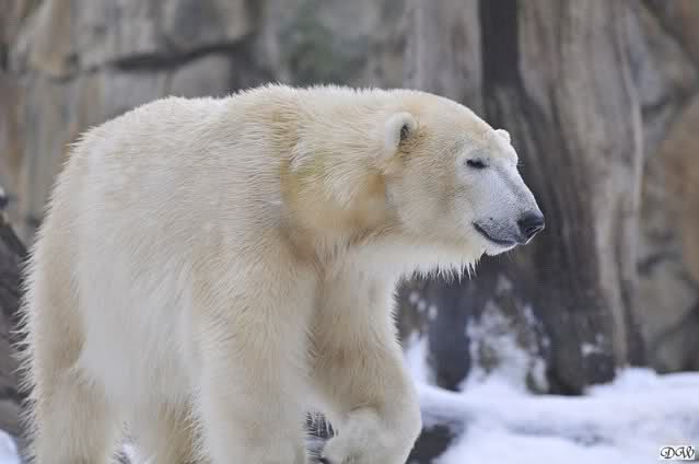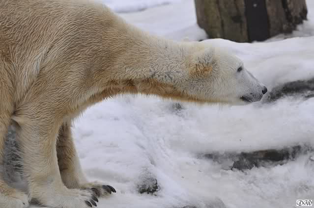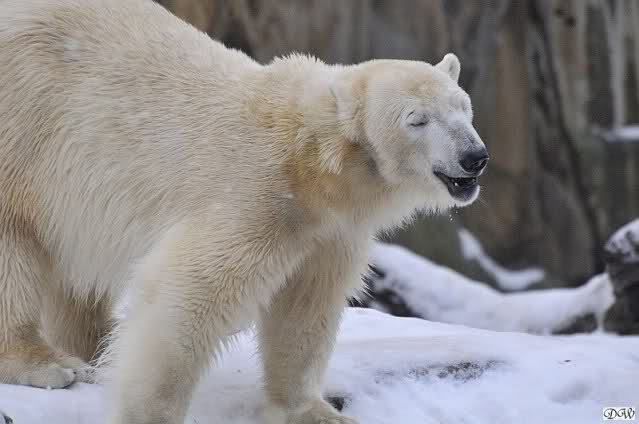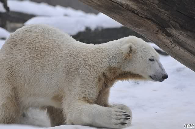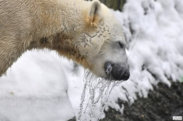 Inzwischen hatte ich sehr unangenehm kalte und nasse Füße bekommen, denn auch die Wege im Zoo waren zertreten und matschig geworden. Ich drehte noch einmal eine Runde, vorbei am Gehege der Eisbärinnen. Jetzt kuschelten wieder alle drei miteinander, wie damals, als Lars noch da war.