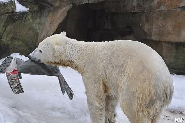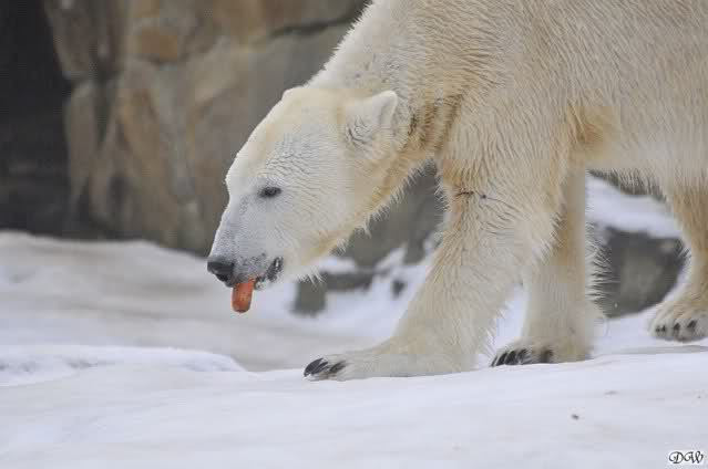 Niemand hat uns hinausgejagt, wir sind auch freiwillig in den Zoo gegangen. Man konnte sehen, dass Knut und Gianna viel gespielt hatten, den Knut hatte HUNGER. Frau Weckert warf ziemlich viele Möhren und auch ein paar Äpfel auf die Anlage, aber Gianna bekam nicht viel davon ab. Knut beeilte sich und fraß bis auf zwei Möhren alles auf. Gianna kam und versuchte ihm eine halbe Möhre aus der Schnauze zu nehmen und fand flugs die paar Stücke und verschlag sie.