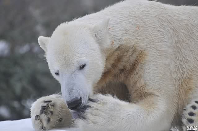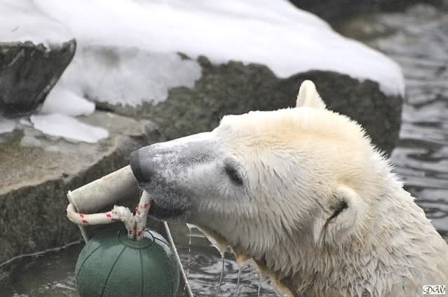 Vielleicht war es deshalb, dass sie sich partout nicht zum Spielen bewegen lassen wollte. Knut versuchte alles. Er spielte mit den Kugeln und klapperte damit herum bis sie endlich kam. Er versuchte sie dazu zu bewegen mit ihm ins Wasser zu kommen, aber sie wollte sein Spielzeug nur wegnehmen. Wieder und wieder. Er nahm das Nackthuhn und klatschte im Wasser herum, sie kam hinunter und zog daranb, er benutzte die Gelegenheit um zu schmusen. Sie wollte nicht. Also planschte er im Wasser weiter, laut. Sie kam um zu schauen und wieder gab es kurzen Kontakt. Dann holte er sich den Ball und wollte ihn zu den Zuschauern werfen. Aber die Gedanken waren wohl bei Gianna. Immer wieder ging der Bick zu ihr. Endlich gab er auf. Er legte sich hin und begann seine Übungen und Körperpflege. Goldig sah er aus wie eh und je.