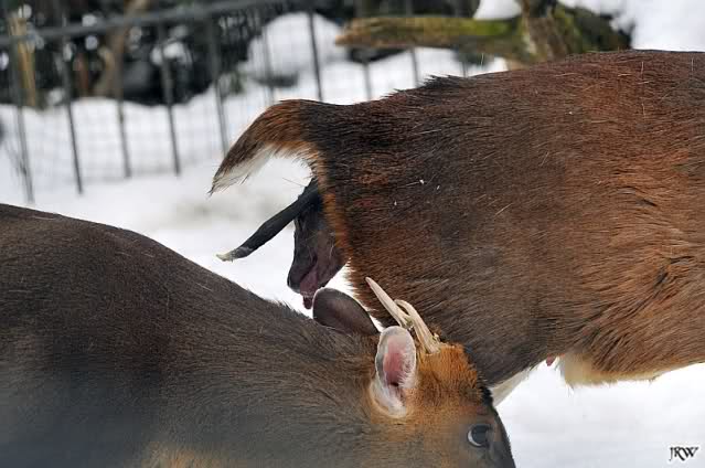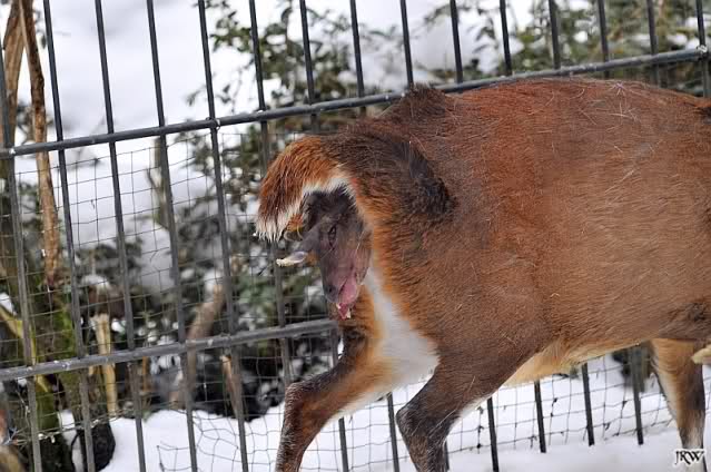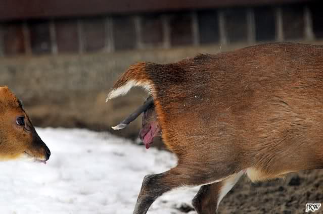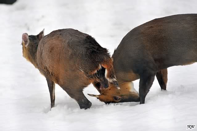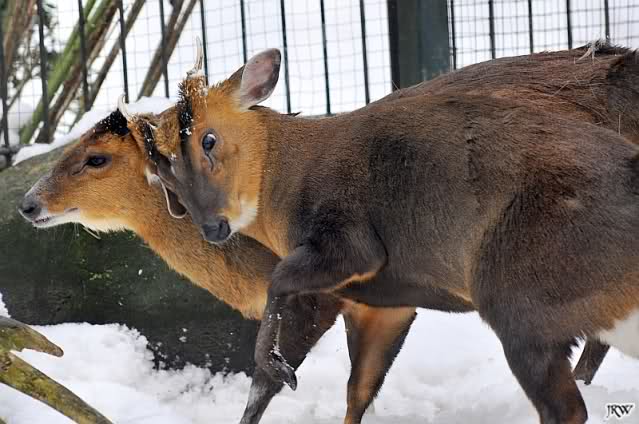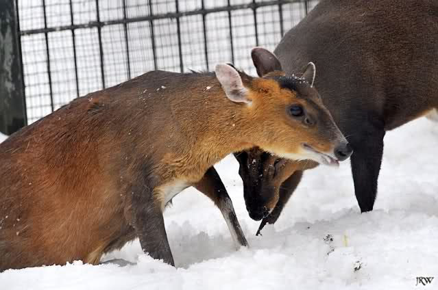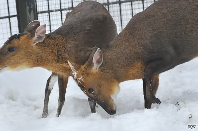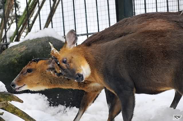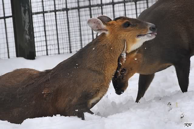 ... wir hörten ein Fiepen bei den Muntjaks. Also schauten wir hin und sahen eine Muntjak-Kuh im Schnee liegen und einen Bock, der sie konstant zu Aufstehen bewegen wollte und sie mit seinen Hörnern anstieß, um sie in den rettenden Stall zu treiben. Sie stand zwar auf und legte sich aber immer wieder hin. Der Vorgang wiederholte sich mehrmals, immer wieder versuchte der Bock, sie aufzubringen.