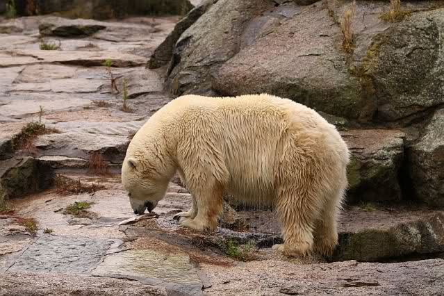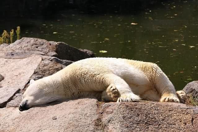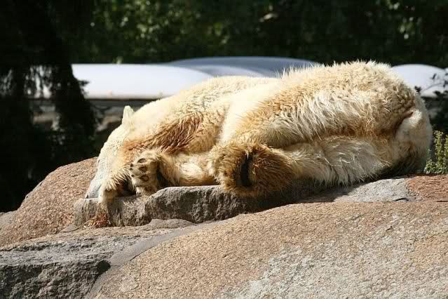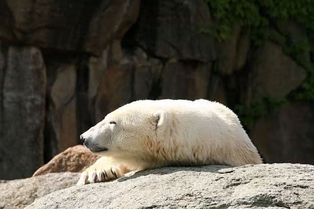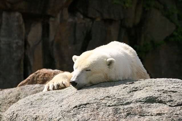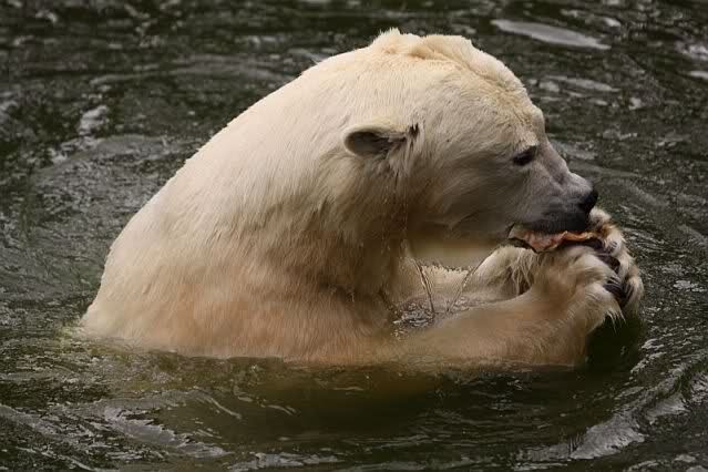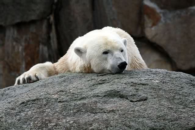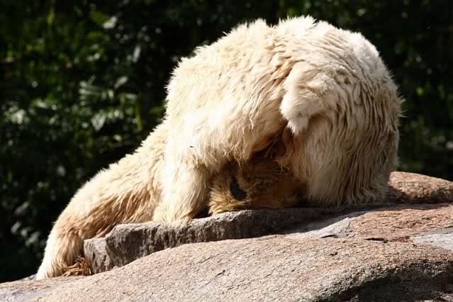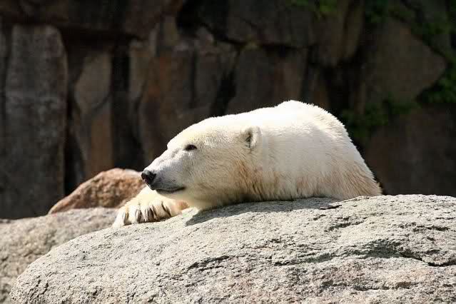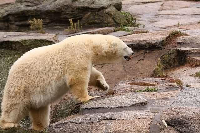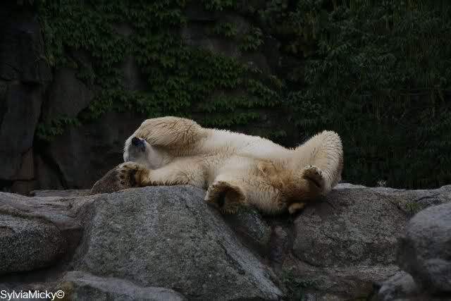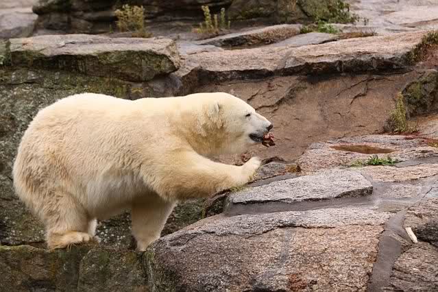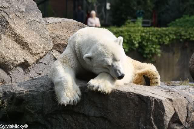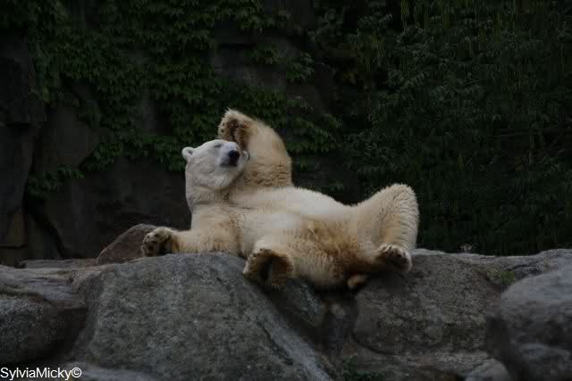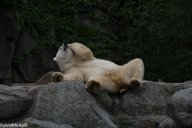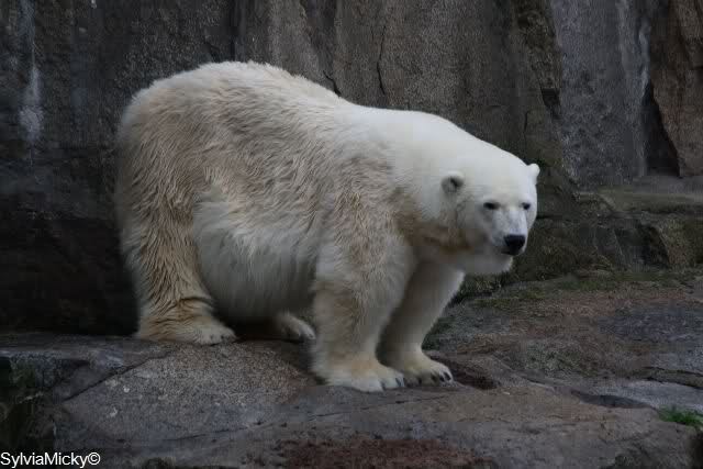 Mangels Beschäftigung müssen sich die großen Eisbären leider den ganzen Tag langweilen. Einmal am Tag - zur Fütterung - dürfen sie sich bewegen, die Armen.