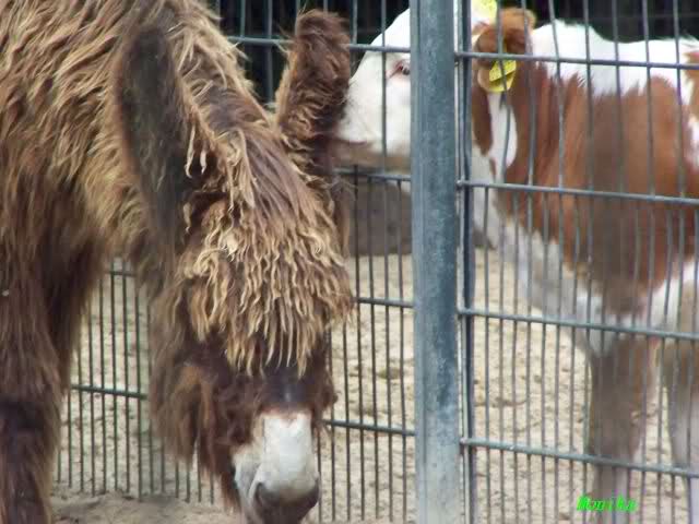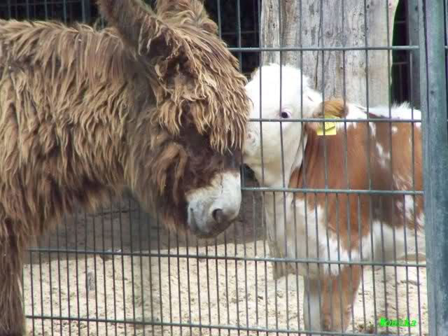 Das Kälbchen schmuste durchs Gitter mit Nachbar Esel
