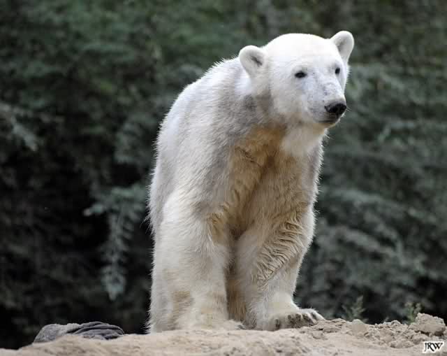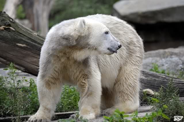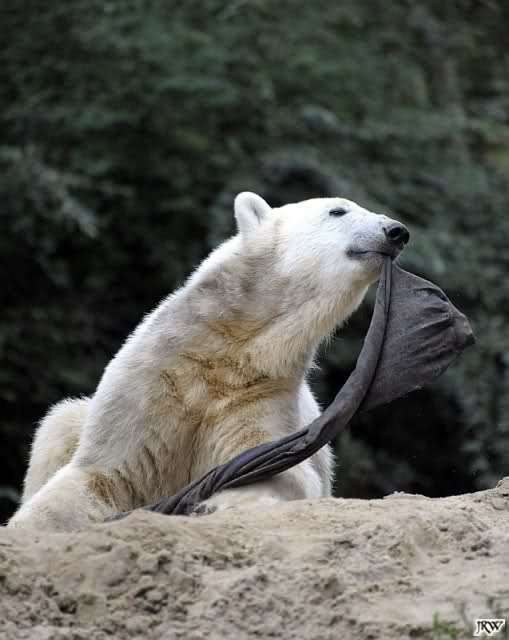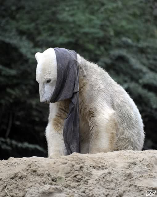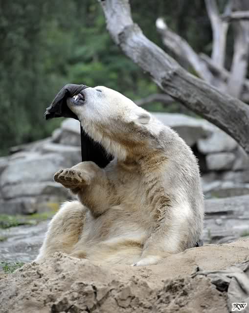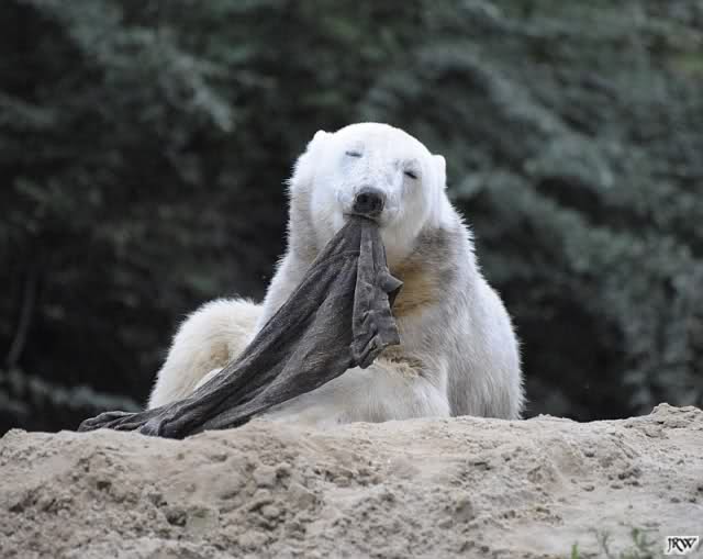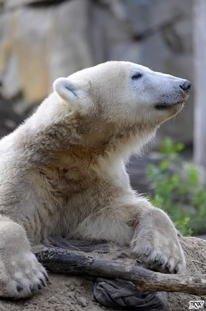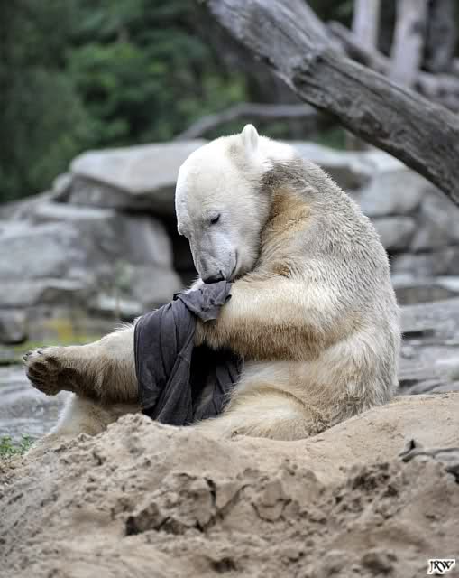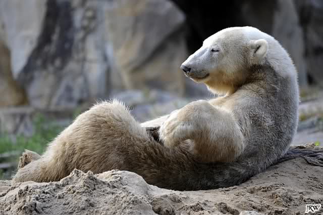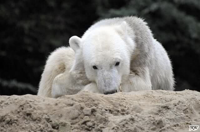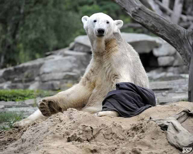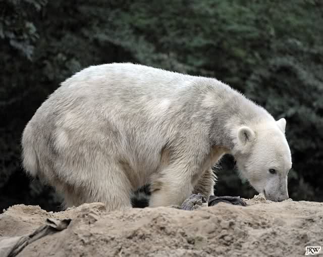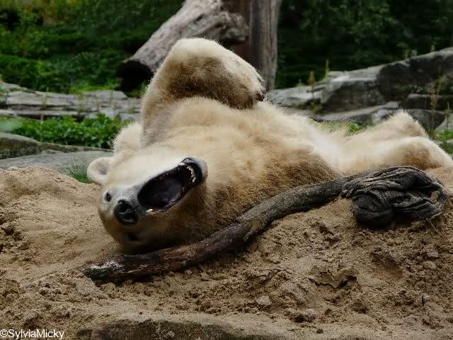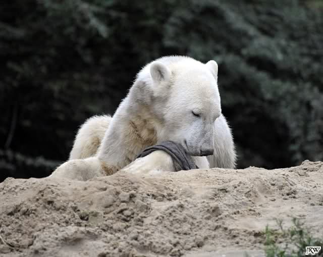 Allerdings war ich auch noch nie so lange im Zoo. Knut fing an zu gärtnern. Er riss Pflanzen aus und trug sie hierhin und dorthin. Dann ging er zu seinem Sandhaufen und begann ihn umzugraben. Er grub schließlich ein Loch, wo genau sein kleiner Hintern hineinpasste. Dann legte er sich hinein, drehte uns den Rücken zu und machte ein Nickerchen. Aber nicht lange.