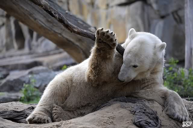 Bei den Eisbären war Lars noch draußen. Er lag oben auf dem Felsen, malerisch dahin gegossen. Seine Frauen hatten sich bereits verzogen, man sah nur noch zwei Eisbärenköpfe in den Höhlen.