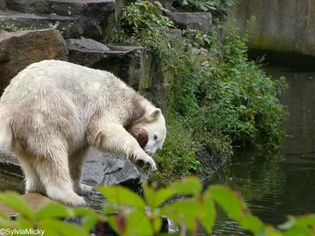 Nach der Nasenbärenfütterung, die heute der junge Mann machte, wurden wie immer die Braunbären gefüttert. Dann war Knut endlich an der Reihe. Leider kann ich von dieser Fütterung nicht viel sagen, weil ich kaum etwas gesehen habe. Es war heute wirklich sehr voll. Ich sah aber, wie Knut die Kokosnuss bekam. Später erfuhr ich, dass Herr Dörflein die Nuss bereits „angeknackt“ hatte, damit Knut sie leichter aufbekommt.