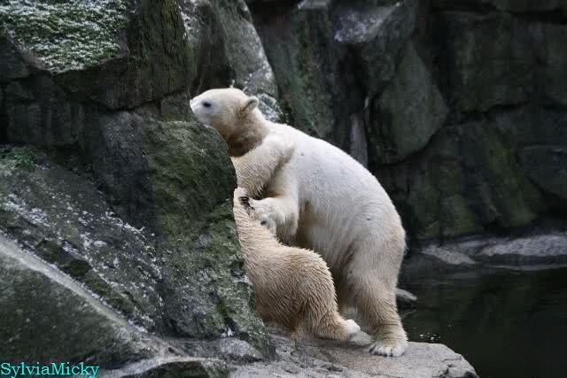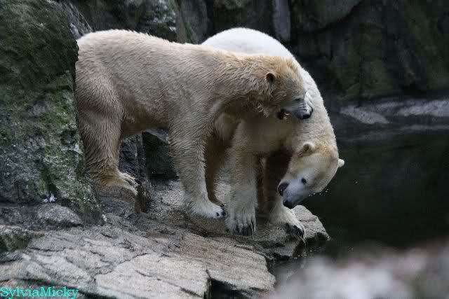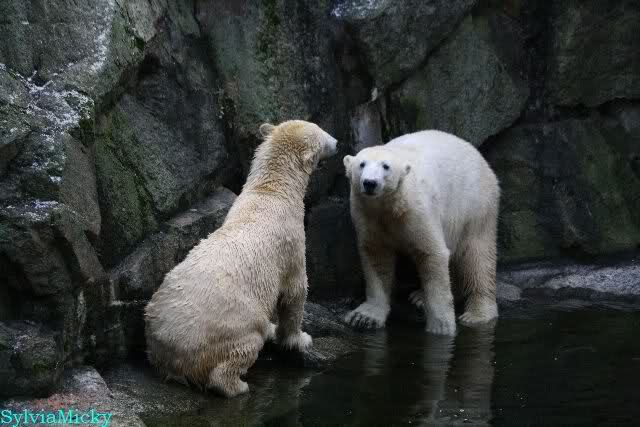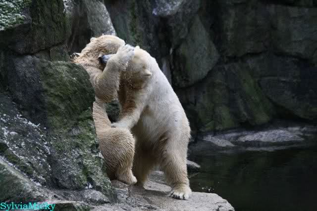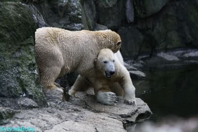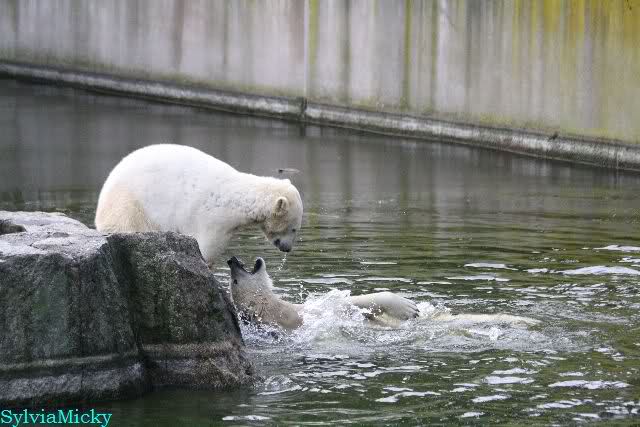 Knut hatte heute nicht viel mit seiner Mutter im Sinn, obwohl sie alle Register zog, um ihn ins Wasser zu locken und zum Spielen zu animieren. Immer, wenn sie ihm zu nahe kam, wurde geschnauft und eine Schippe gezogen. Wird Knut etwa zum flapsigen Teenager, der nicht mehr mit seiner Mutter "abhängen" will? Jedenfalls blieb Knut oben auf den Felsen und machte einen auf ungenießbar.