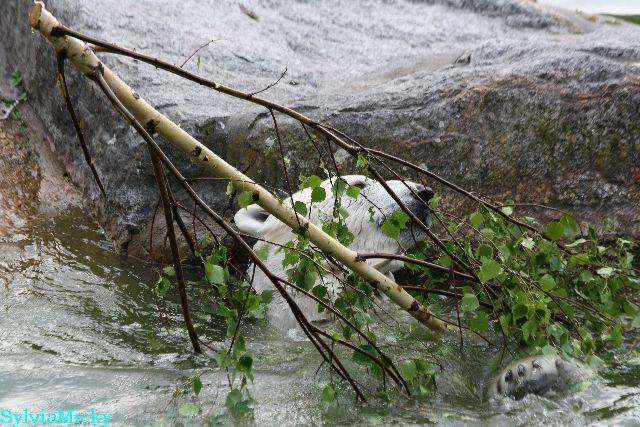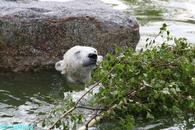 Am Nachmittag bekamen die Bären wieder Zweige. Als erste ging Tosca ins Wasser, dann Kati. Nancy zierte sich lange. Dann aber waren alle drei im Wasser. Sie spielten mit den Zweigen und tobten miteinander im Wasser.