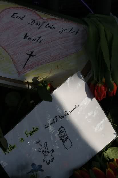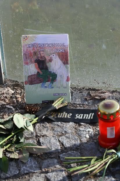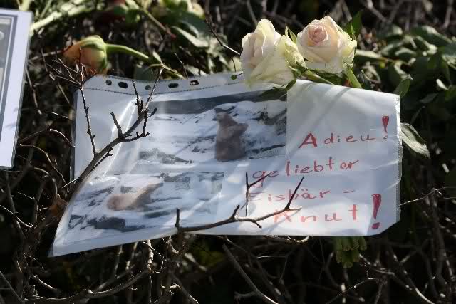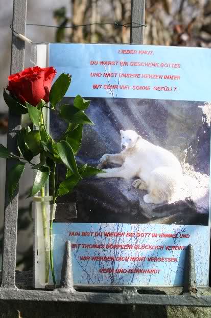 So groß die Trauer ist, und jeder trauert anders, meine Tränen liefen ja auch ohne Ende, heute geht's etwas besser. Aber das Foto mit den Rosen und dem Croissant hat mich schmunzeln lassen. Das drückt soviel Liebe und Hingabe zu Knut aus, und trotz unendlicher Trauer doch auch Humor. Und der schadet nie...Und Knut war ja lustig, kein Zweifel. Erinnert ihr Euch dran, wie er noch ganz klein im Innenhof den Fahrradsattel der Pfleger auseinander genommen hat? Ich mußte so lachen...