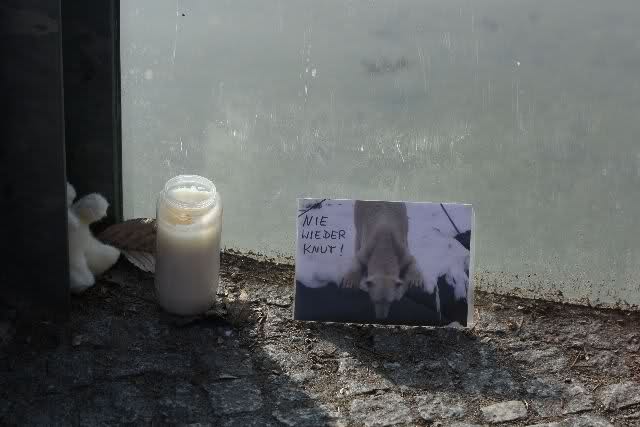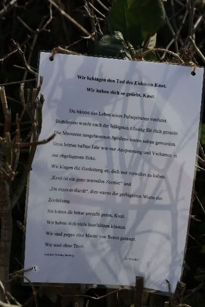 Jetzt mit einem Spendenaufruf an die Bevölkerung heranzutreten ist m.E. pietätlos, ebenso wie eine andere Spendenaktion, wo Knut "vor den Karren gespannt wurde", damit genügend Geld eingeht, für einen Umbau der Bärengehege, der noch in diesem Jahr beginnen sollte. Es wäre jedoch in ganz kurzer Zeit und mit ganz geringen Mitteln möglich gewesen, den Eisbären ein besseres Zuhause zu bieten. Aber das wissen wir alle und ist oft genug diskutiert worden, dass wo ein Wille gewesen wäre, hätte es sofort auch einen guten Weg gegeben, die jetzige Anlage attraktiver zu gestalten. Wir wissen auch alle, dass Knut seit September, seitdem er in der großen Anlage war, kein Spielzeug mehr bekam, die Unterbringung bei den drei großen Eisbärdamen nicht entspannt war, im Gegenteil. Den Besuchern und Knutfreunden waren die Hände gebunden und manche haben die Situation verharmlost. Alle Briefe um Aufmerksamkeit und Änderung der unglücklichen Unterbringung von Knut an verschiedene höhere Stellen, brachte wenig oder gar nichts, man stellte sich taub.