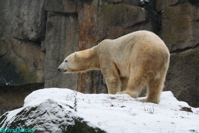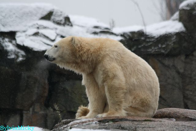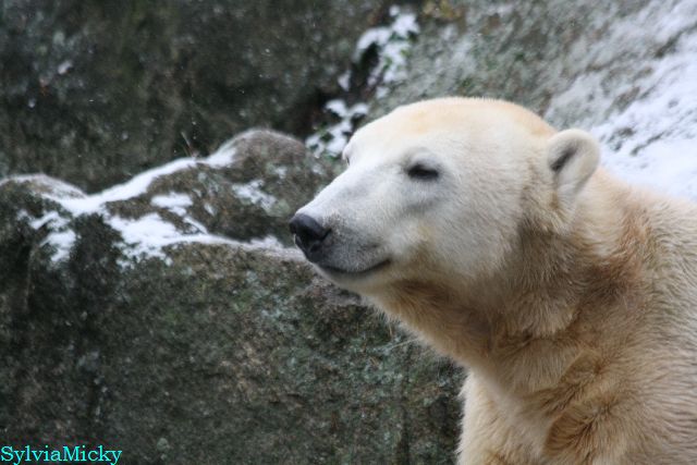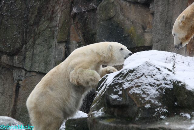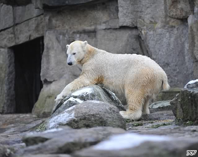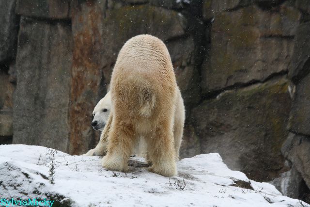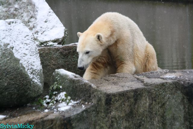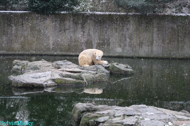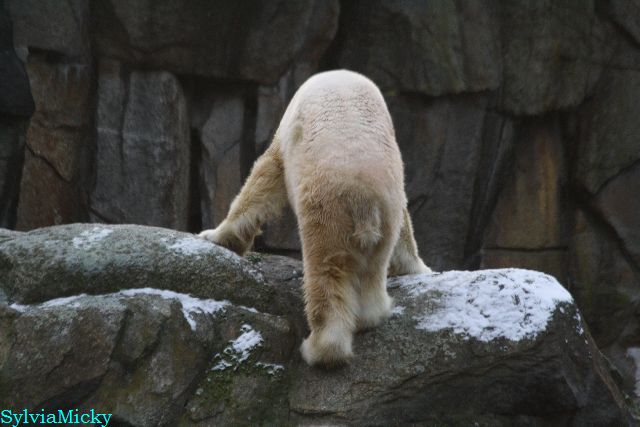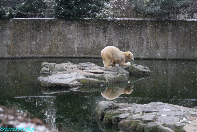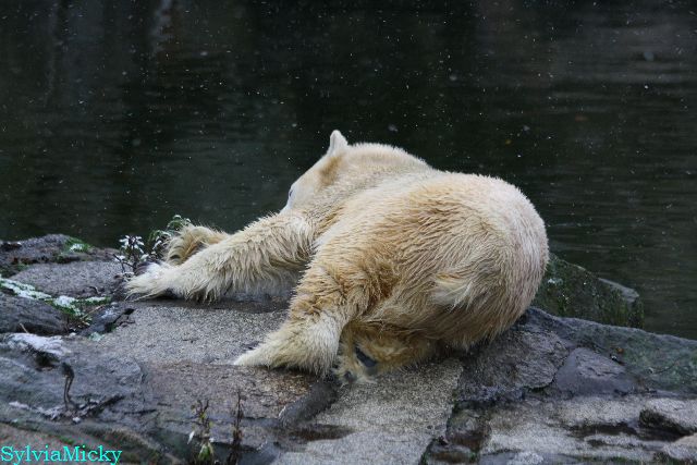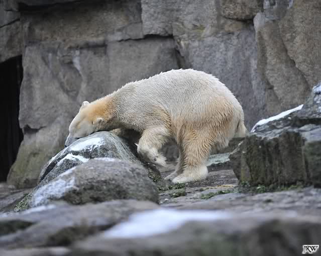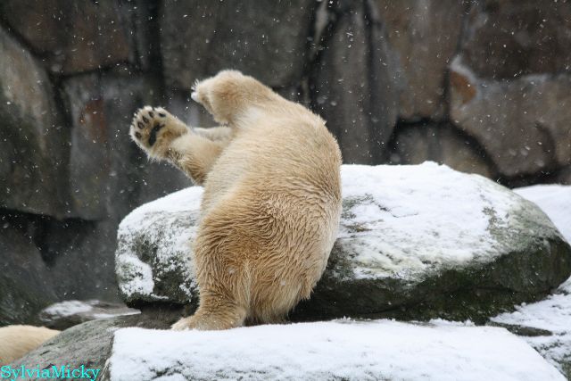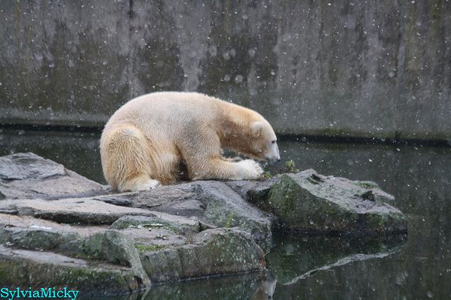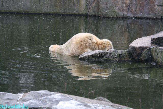 Kleinigkeiten, die einen Bären glücklich machen. Gestern ein Kürbis außerhalb der normalen Fütterungszeit und heute eine Kokosnuss. Wieder brachte Herr Röbke Knut ein kleines Geschenk. Die Kokosnuss! Und wieder versuchte Knut lange Zeit sie heranzupaddeln. Auch das gelang wieder nicht und er ging ins Wasser um sie zu holen. Danach spielte er lange damit auf der Toska-Insel, jonglierte mit ihr herum und als sie ins Wasser fiel, sprang er hinterher und spielte dort ausgelassen weiter. Später fand er sein T-Shirt und wirbelte es durch die Luft. Er sah glücklich und zufrieden aus. Der Schnee gefällt ihm auch wieder. Er legte sich über die Felsen, wischte und leckte den Schnee ab. Wie sagte das kleine Mädchen vor langer Zeit? Knut ist ein Zauberbär! Das ist er und wird es, wenn man ihm die Gelegenheit gibt, auch immer bleiben.
