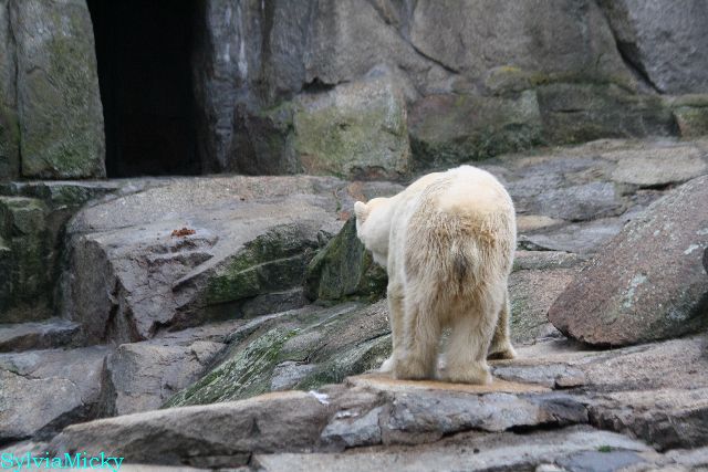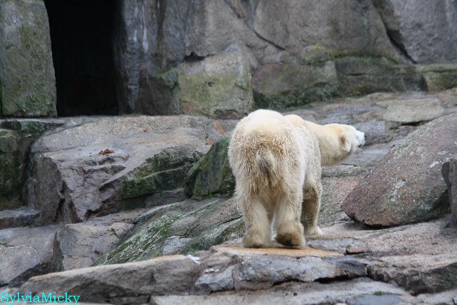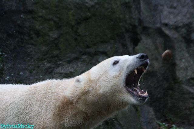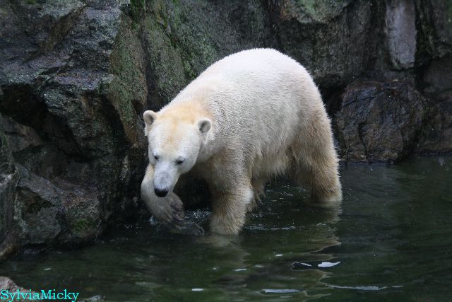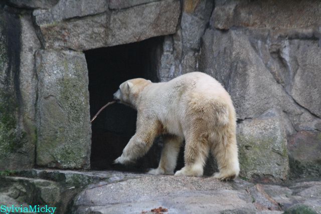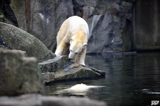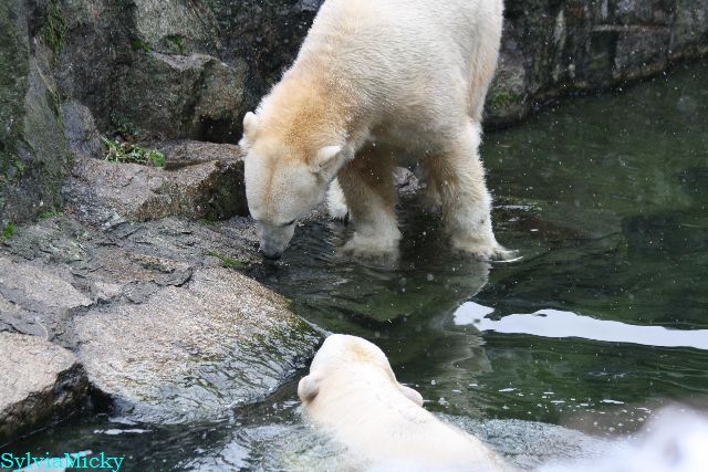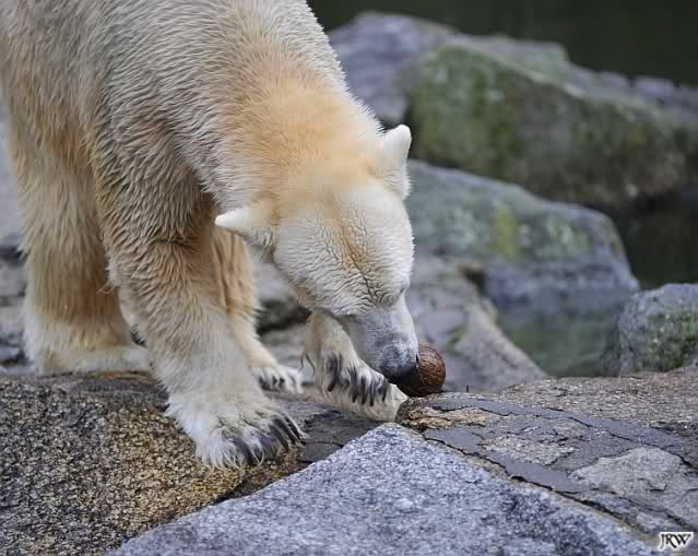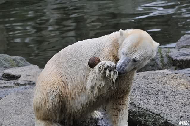 Eine Dame fragte Herrn Röbke, der auch heute wieder lange Zeit am Gehege stand und Knut beobachtete, ob Knut die Kokosnuss denn fressen würde. Er sagte wahrscheinlich nicht, aber er sollte Beschäftigung haben. Wäre es nicht schön, wenn so etwas öfter passieren würde? Der Bär wäre glücklich und vielleicht würden es die Pfleger auch genießen. Meine Daumen bleiben gedrückt und mein Dank geht ausdrücklich an MR für diese für ihn so kleine, für den Bären jedoch riesengroße Geste. Die Bärinnen würden sich bestimmt auch über Kleinigkeiten freuen.