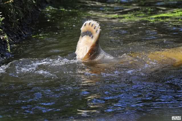 Als wir heute zu Knut kamen, spielte er ausgelassen im Wasser. Da es schon fast 14.00 Uhr war, waren wir etwas verwundert. Sonst läuft er in Erwartung des Futters schon herum. Man erzählte mir später, dass Knut schon um 12.30 anfing zu laufen. Man wollte ihn ablenken und machte Seifenblasen. Dafür wurde die Knutfreundin sofort von einer Besucherin zurechtgewiesen. Sie ließ sich nicht beirren und siehe da, es wirkte. Es ist leicht Knut abzulenken. Das hatte schon immer sein Ziehvater bewiesen, er warf ihm oft kleine Dinge zu. Nun spielte er vergnügt im Wasser und erst als Frau Weckert die Karre bei den Braunbären abstellte, schnellte er aus dem Wasser und hielt Ausschau.