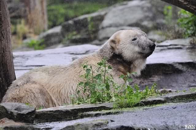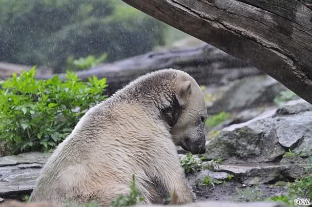 Heute Vormittag bei strömenden Regen waren schon einige Knutfreunde am Gehege. Auch Mervi und ihr Mann waren da und KnutiJudi und einige andere auch. Die Fütterung machte heute Frau Weckert. Sie bekam von einer Besucherin Leckereien für Knut. Als der Regen nachließ kam die Sonne und auch die Wespen. Ich bin dann ins Affenhaus gegangen.