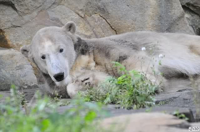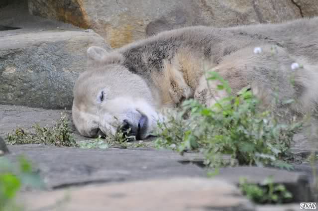Nach der Abendfütterung kam Knut wieder heraus und sah nicht so gut aus. Er schien schwer zu atmen und war generell schläfrig. Hoffentlich ging es ihm nachher wieder besser. Als wir ihn verließen, lag er immer noch dort, es war kurz vor 19.00 Uhr und Zeit zu gehen.