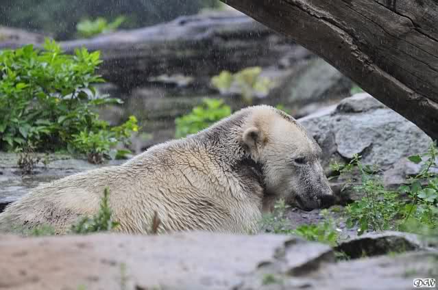 Heute war von dem Unwohlsein von gestern Abend war nichts mehr zu sehen. Heute war es ein anderes: es regnete in Strömen. Knut hat morgens schon im Wasser gespielt und sich dann zur Ruhe gelegt. Allerdings machte der Regen ihm zu schaffen. Soviel Wasser von oben fand er nicht spannend und blickte immer wieder auf. Als es dann endlich kurz aufhörte, konnte er beruhigt schlafen.