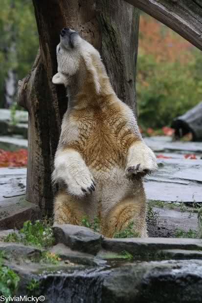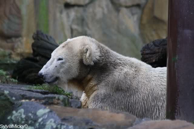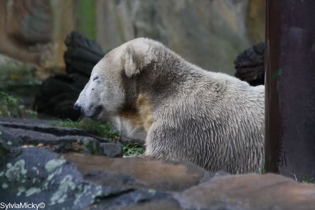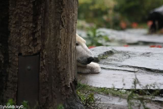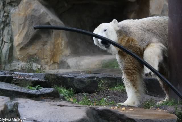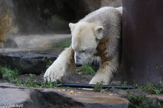 Es ist heute wieder ein nasser und kalter Tag. Als ich heute Morgen in den Zoo kam, lag Knut ziemlich dicht bei Gianna und betrieb ausführliche Maniküre. Wie ich gehört habe, sollen sich die beiden gestern wegen eines Kürbisses ziemlich angezickt und angeknurrt habe. Davon spürte man heute nichts mehr. Heute war es Knut, der Giannas Nähe suchte. Als sie lag und auch geschlafen hat, ist er immer wieder zu ihr um zu gucken. Während Gianna schlief, ging Knut ins Wasser und spielte schön mit seinem Baumstamm, Nackthuhn und dem Schlauch. Als er aus dem Wasser kam, ging Gianna runter zum Pool. Sie angelte sich den Schlauch aus dem Wasser und spielte damit. Dann trug sie den Schlauch nach oben und legte ihn auf den Felsen. Sie ging dann auch nach oben und spielte weiter. Knut schaute etwas verdutzt und versuchte aus allen Richtungen an den Schlauch zu kommen. Aber vergeblich. Gianna ließ ihn nicht mehr los. Sie legte sich dann auf den Schlauch und schlief erstmal eine Runde.Als sie dann irgendwann mal aufstand, beschnupperte Knut den Schlauch ausgiebig, ließ ihn aber liegen. Es lief alles sehr friedlich ab, kein Gebrumme und auch die Tapirlippe habe ich heute vermißt.