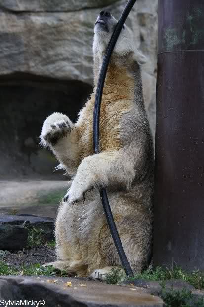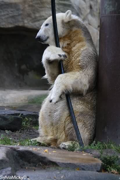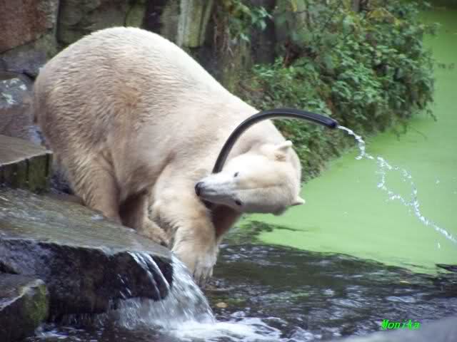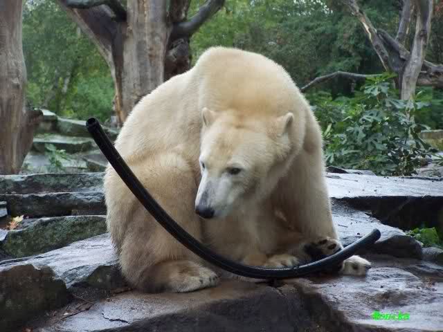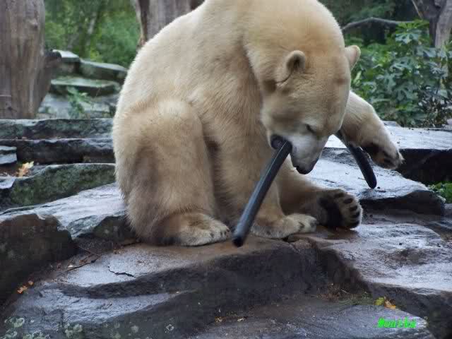 Ich wäre gerne dabei gewesen, wie Knut von allen Seiten versucht, an seinen Schlauch heran zu kommen.