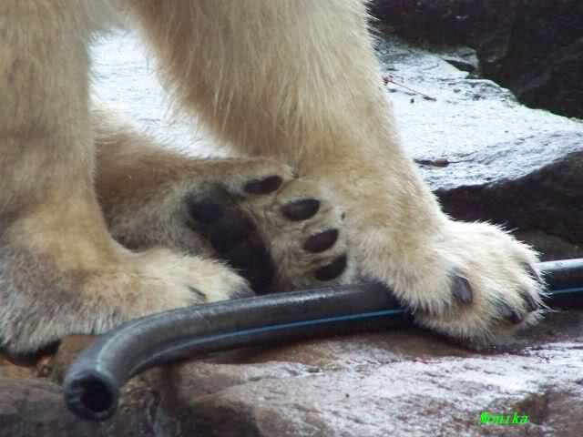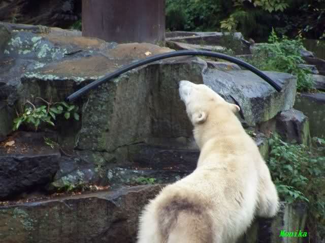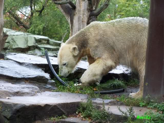 Nach dem Tierpark müssten wir natürlich schnell noch einmal bei den Beiden vorbeisehen. Auch nachmittags spielte sie kurz mit dem Schlauch und Knut schaute aus sicherer Entfernung zu. Als sie ihn liegen ließ, beschnupperte er ihn wieder, nahm ihn jedoch nicht auf. Zu dieser Zeit regnete es schon wieder und keiner der beiden Bären sah besonders glücklich aus.