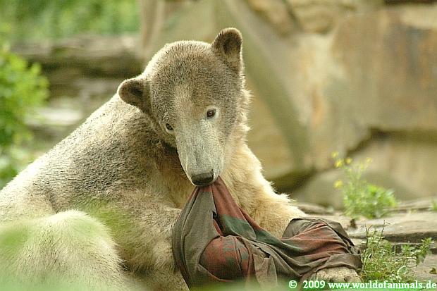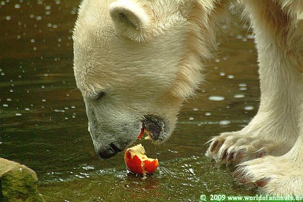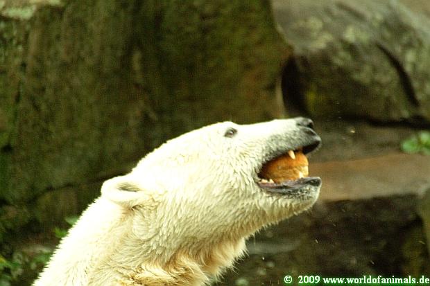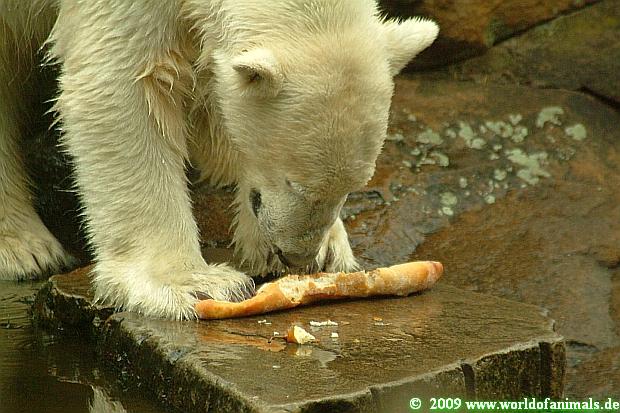 Knut's eigenen Kopf kann man selbst bei der Fütterung erkennen. Alles was ihm zu gegebener Zeit nicht interessant erscheint, lässt er entweder an seinen Zähnen abprallen oder spuckt es aus nur um sofort die Essentials wie Fisch, Fleisch, Weintrauben, Kartoffeln und natürlich Croissants zu fordern. Alles andere wird später auf der Anlage eingesammelt und verspeist oder aber aus dem Wasser geholt.