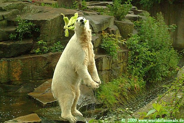 Der Futterwerfer steht höher als Knut! Wenn Knut auf seinen 4 Tatzen steht, kann er das Futter nicht mit der Schnauze fangen, er muß sich dafür auf die Hinterbeine stellen. Mit den Vorderbeinen „wedelt“ er, um das Gleichgewicht zu halten.