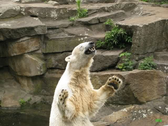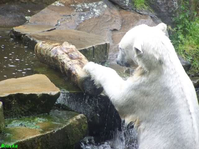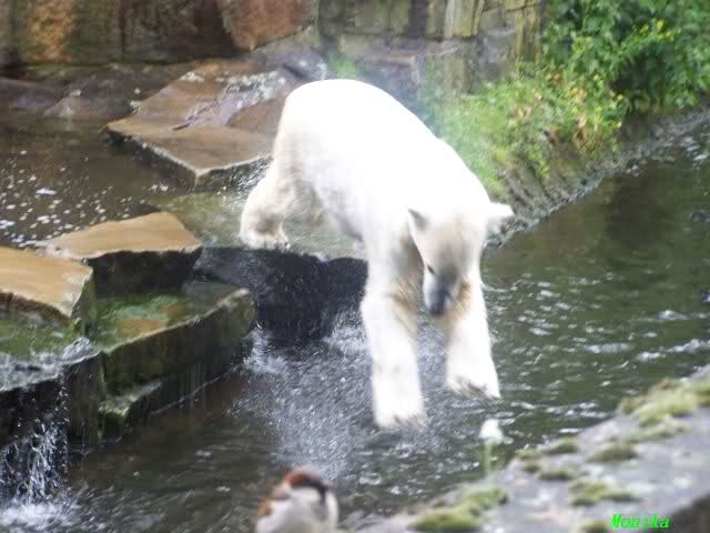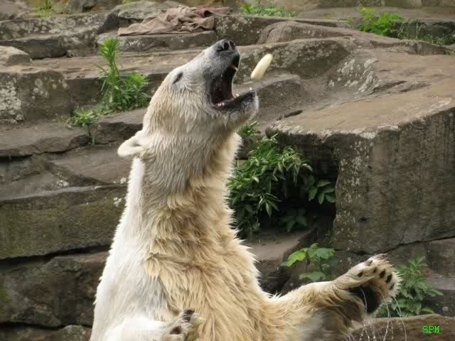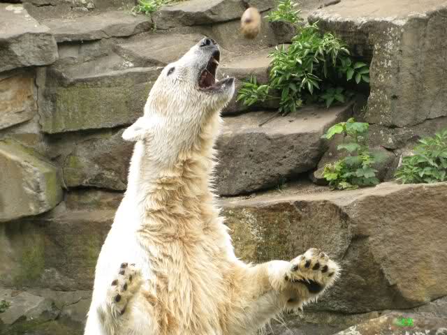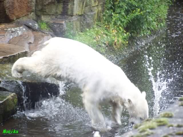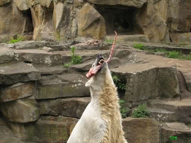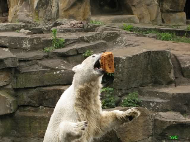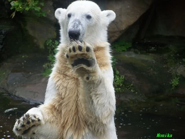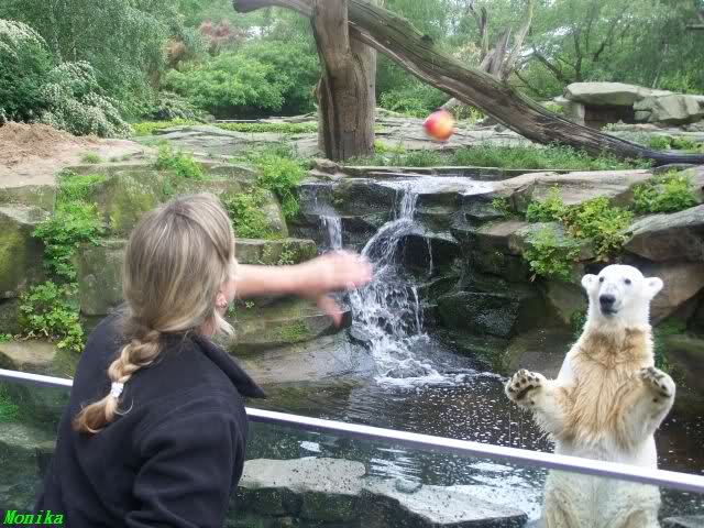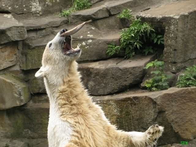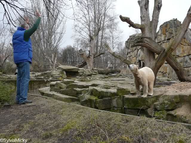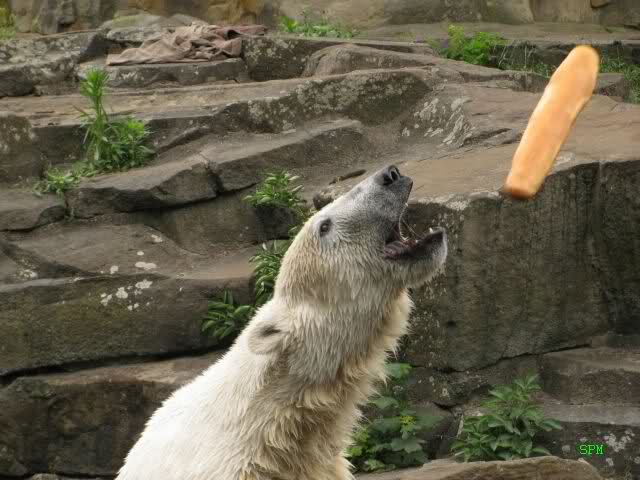 Ich finde die Bilder, wo Knut fuer sein Fressen "Maennchen" machen muss, garnicht schoen, eher sehr traurig. Da muss dieses stolze Raubtier jeden Tag fuer sein Fressen 'Faxen' machen. Artgerecht? Mehr oder weniger wie ein Zirkustier. Armer Kerl ist besser.