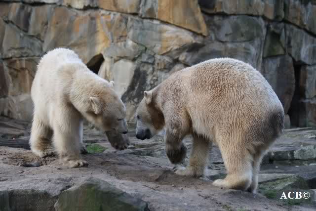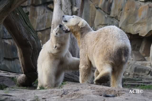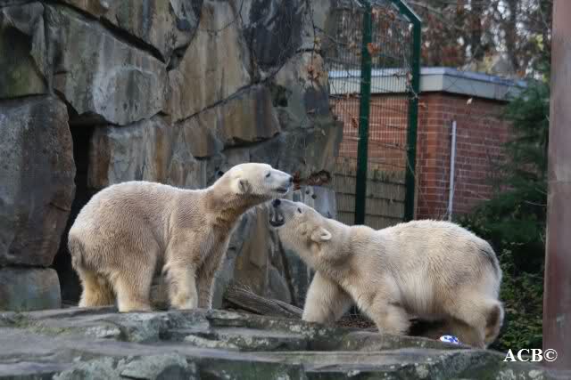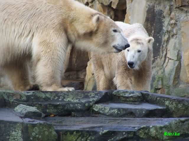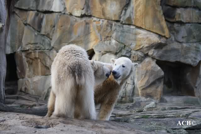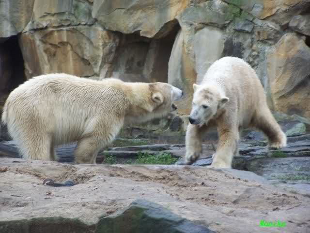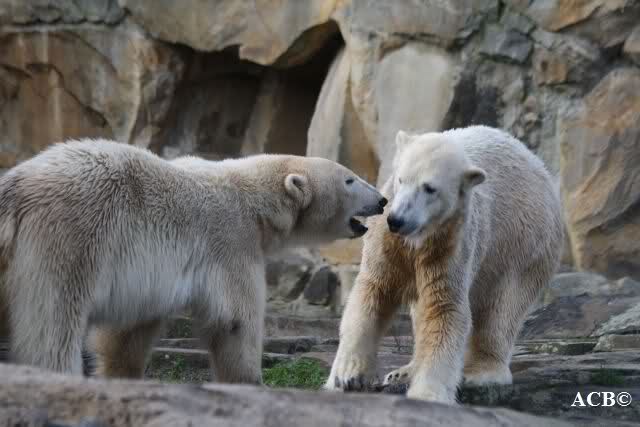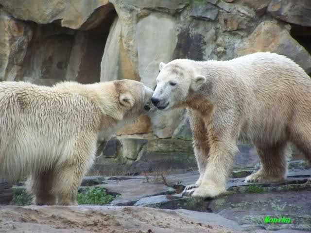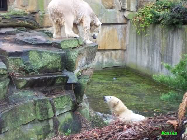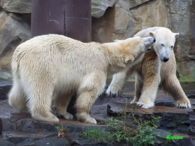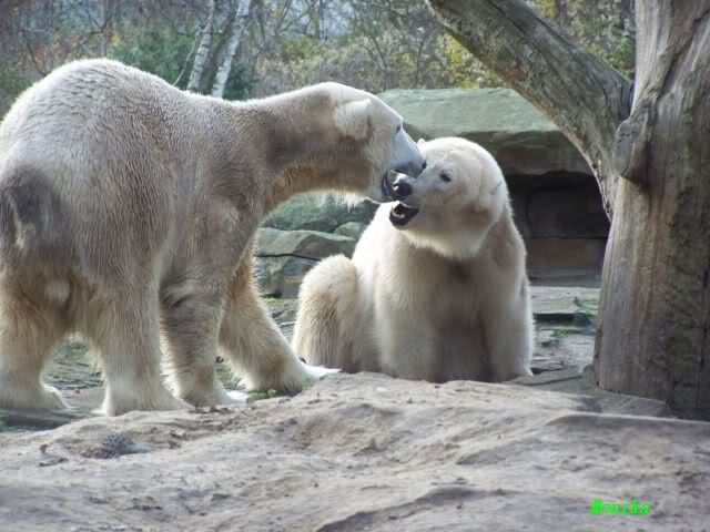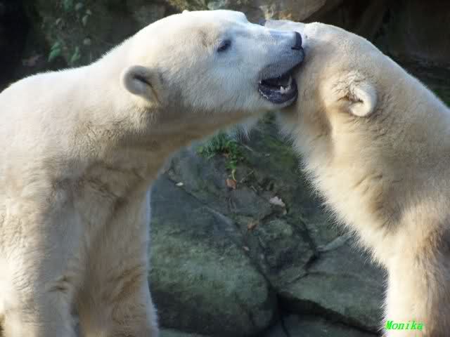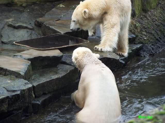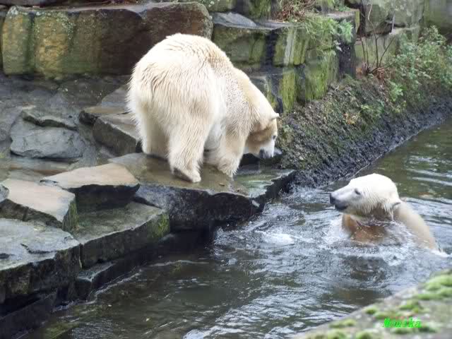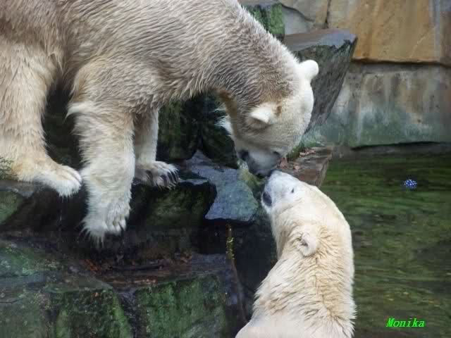 Knut und Gianna störte das alles nicht. Sie waren allerbester Laune. Knut war in seinem Graben und schwamm. Gianna behielt ihn vom Felsen aus genau um Auge. Als Knut das Wasser verlassen wollte, kam Gianna angerannt und es gab eine Menge bäriger Küsschen.