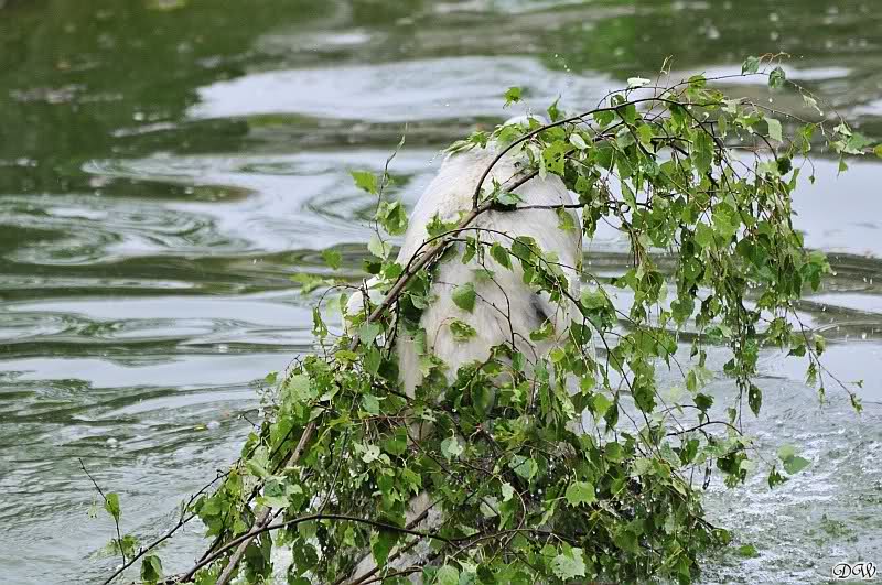 Kati spielte super mit dem Zweig im Wasser. Auch Ohrenschlecken ist schön. Ich hoffe nur, dass Tosca vielleicht in Hitze ist und wird sich bald beruhigen. Sie ist eindeutig gereizt.