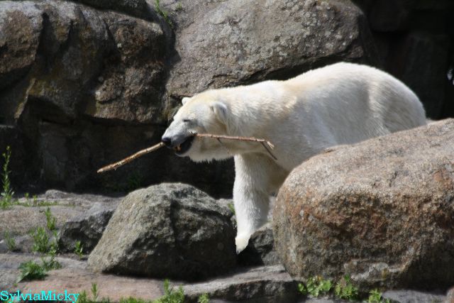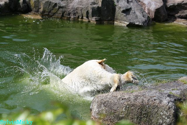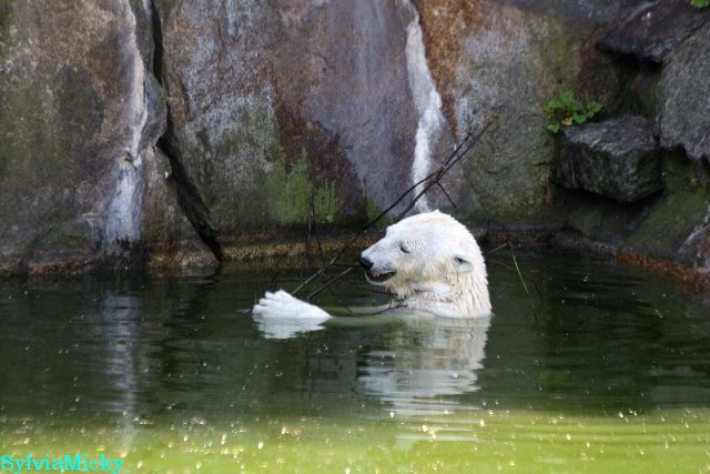 Nachmittags lief Tosca nicht. Sie ging in Kati’s Höhle und legte sich hin. Nancy kam dazu und konnte endlich an Tosca’s Ohren schlecken. Wir haben uns gefreut. Diese Freude dauerte nicht lange. Nachdem Kati kurz allein mit einem frischen Zweig spielte und immer wieder nach oben zu den beiden anderen schaute, wollte sie nach ausgiebigem Schubbern und Kratzen zu den Beiden gehen. Plötzlich schoss Tosca aus der Höhle und griff Kati brüllend ein zweites Mal an, die sich natürlich wehrte. Die Stimmung zwischen den Bärinnen war danach endgültig hinpber und jede suchte sich einen eigenen Platz. Als wir kurz vor 20:00 mit einer Führung bei dem Eisbärenfelsen vorbeikamen, lief Tosca in der Abendsonne auf ihrer Insel frenetisch hin und her, Kati lag auf Knut’s Seite und Nancy war nicht zu sehen.