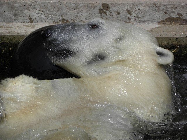 Heute Morgen bin ich schon sehr früh in den Tiergarten gefahren und habe so nicht mehr gelesen, dass Felix schon wieder da ist. Ich habe erstmal drei Stunden bei anderen Tieren verbracht und bin dann mit sehr gemischten Gefühlen in Erwartung eines leeren Geheges in den Aquapark gegangen. Ich habe mich schon gewundert, dass Leute vorm Gehege standen und dachte, dass Vera vielleicht jetzt beide Seiten nutzt, bis ich dann gesehen habe, dass sich zwei Bären in der Anlage befanden, Vera auf ihrer üblichen Seite und tatsächlich Felix auf der anderen. Ich habe dann gleich eine liebe Bekannte getroffen, die mir sofort erzählt hat, dass Flocke und Raspi gut angekommen sind, was mich sehr erleichtert hat. Und die Aussage, die man heute lesen konnte, von wegen Raspi hätte geschrien und getobt, war wohl auch etwas übertrieben. Möglicherweise dachte er, dass er nun allein irgendwo hingekarrt wird, er hatte das ja schon mal. Wie mir von Leuten berichtet wurde, die gestern ebenfalls dort waren, hat er sich beruhigt, als auch Flocke im Auto war.