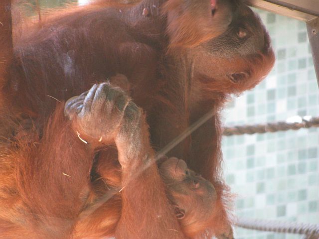 Manu sah den beiden zu, bis er von Bagus eine Ladung Holzwolle über den Kopf bekam. Manu ist ein ganz gutmütiger Papa