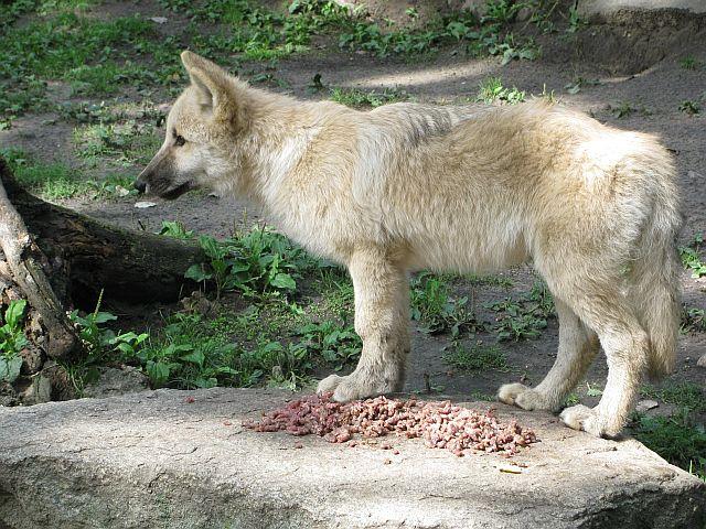 Bei der Fütterung bringt Tosca 2 Stück Fleisch und einen Stock an Land