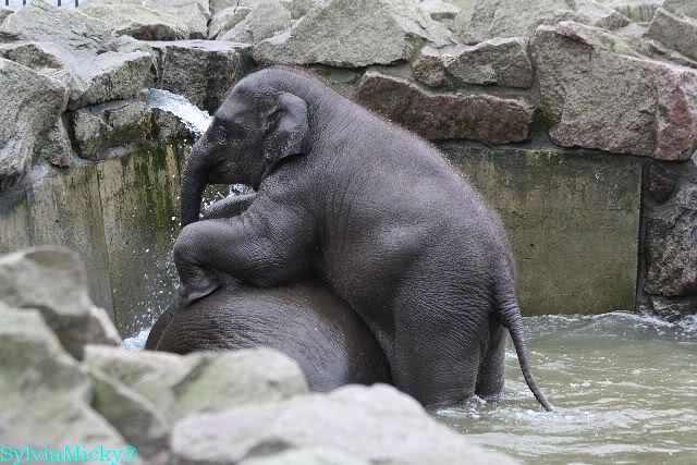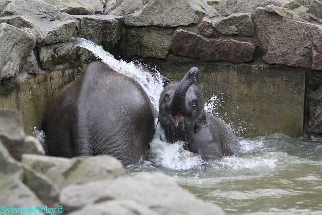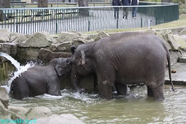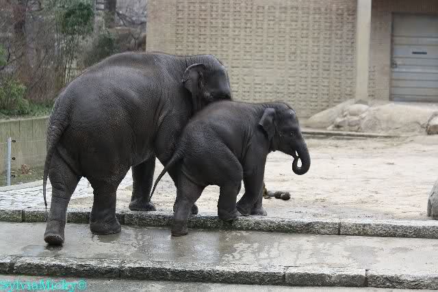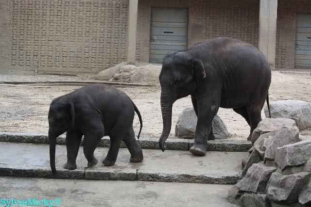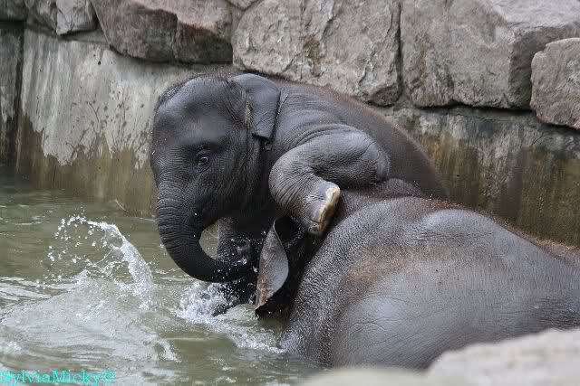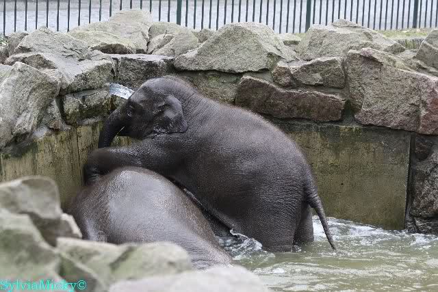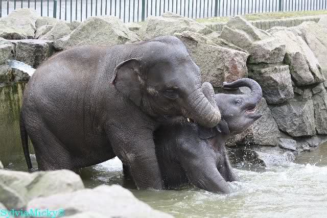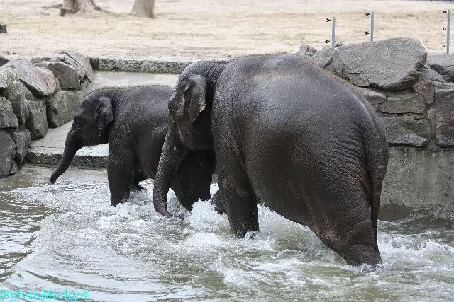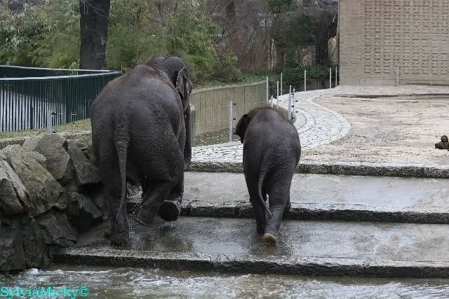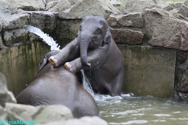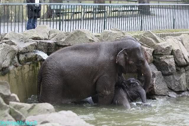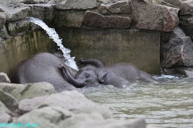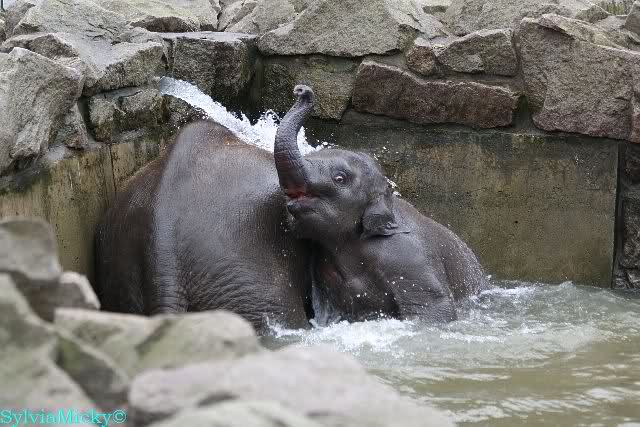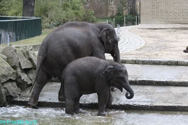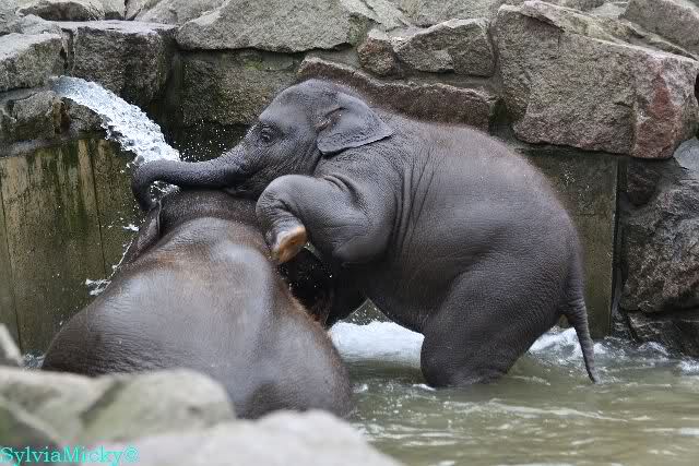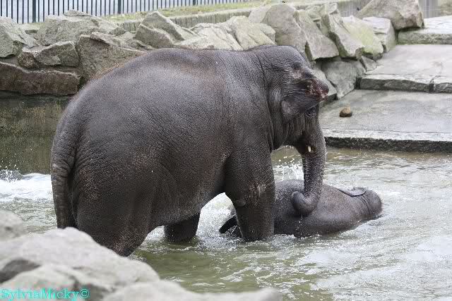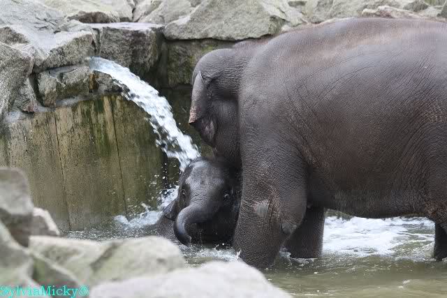 Als Shaina Pali genug hatte schob sie Ko Raya aus dem Wasser. Die wollte aber nicht und lief wieder rein. Die ganze Prozedur wiederholte sich ein paar Mal. Erst als Shaina laut trompetete lief Ko Raya ganz brav mit ihr mit.