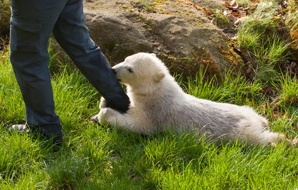 30. April 2008: Los jetzt, Steffi, bleib da und spiel mit mir! Flocke krallt sich am Bein der Pflegerin fest und der bleibt nichts anderes übrig, als geduldig ihren 30 Kilo schweren Schützling durchs Gras zu ziehen. (Foto: Ralf Schedlbauer)