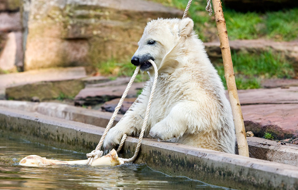 Flocke angelt sich ihr Mittagessen. Ein großer Knochen, der an einem Seil festgebunden im Wasser schwimmt, ist für einen kleinen, aber schlauen Eisbär keine große Herausforderung. (Foto: Ralf Schedlbauer)