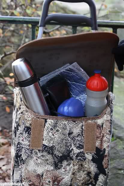 Das Durchschnittsgepäck eines Zoostammbesucher. Rollwagen, Isomatte, Dreibeinstuhl, Thermoskanne, Wasser, Brotbox und Regenschirm.