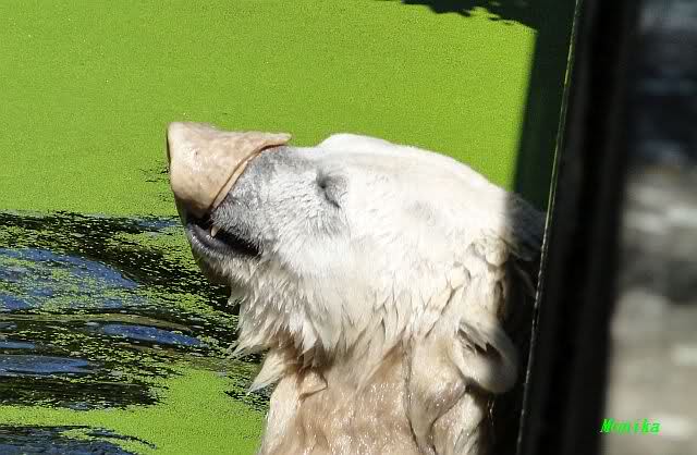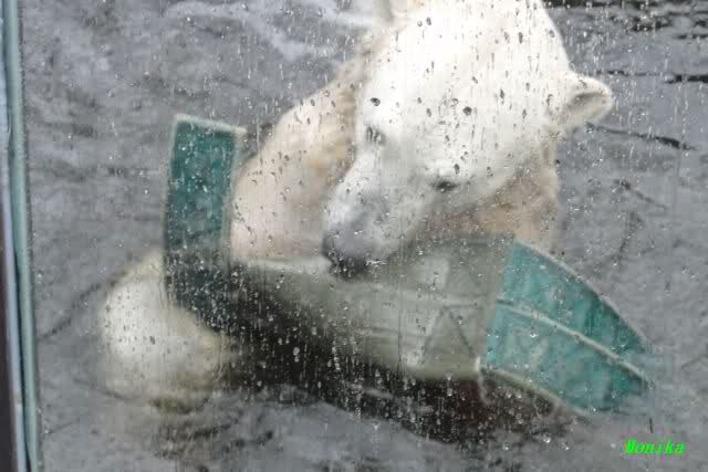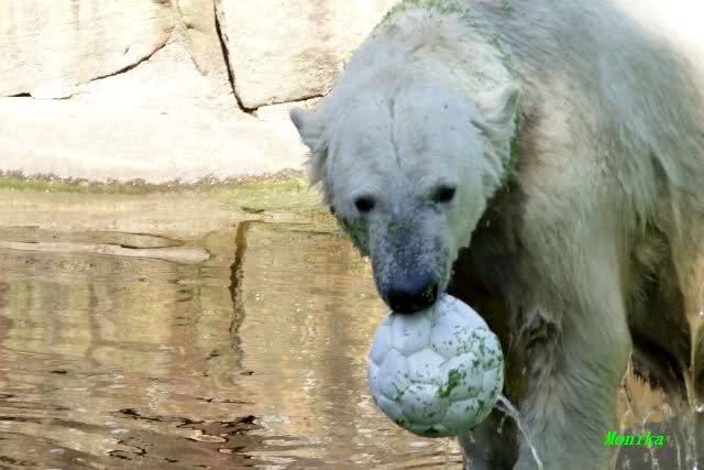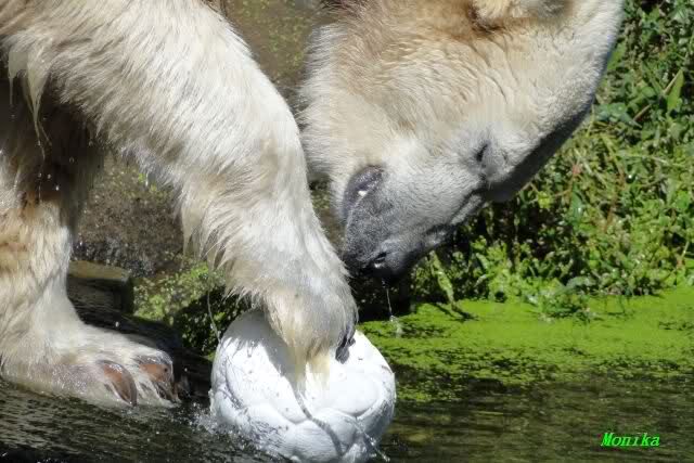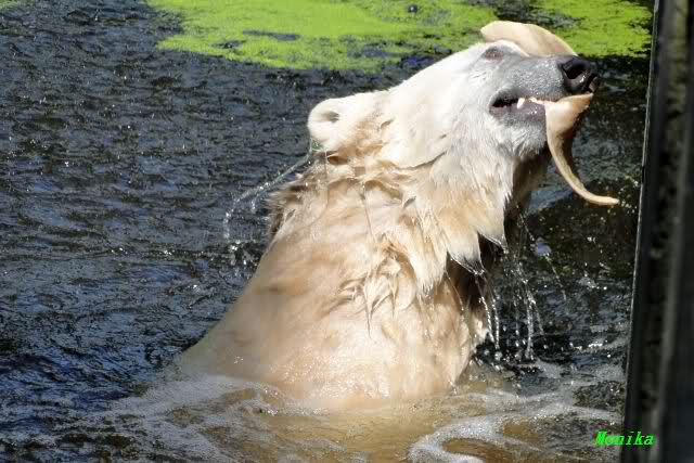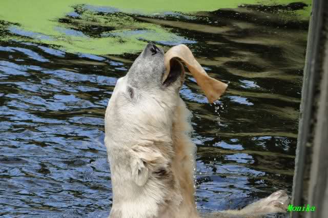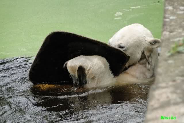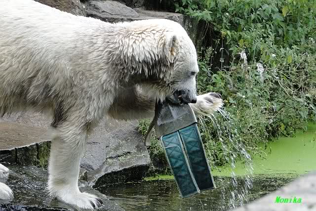 Heute jedoch spielte Knut wieder ausgelassen mit seinem Spielzeug, nachdem er bis kurz vor 12.00 Uhr geschlafen hatte. Langsam wird unser Kleiner größenwahnsinnig. Nachdem er den Ball ein paar Mal zu den Besuchern geworfen hatte, wollte er es mit dem großen Baumstamm probieren. Was ihm natürlich (Gott sei Dank) nicht gelang. Sogar sein Nackthuhn fischte er heute aus dem Wasser. Kurz vor der Fütterung fing es sehr stark an zu regnen, also blieb Knut gleich im Wasser uns spielte fröhlich weiter.