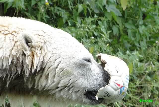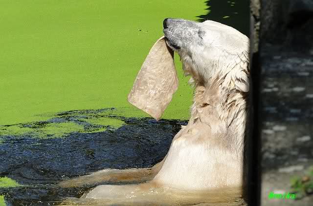 Heute hat Knut jedenfalls noch seelenruhig bis mittags geschlafen. Dann drehte er wieder voll auf. Die Besucher wurden ständig beschäftigt. Mal flog der Ball und mal der Lappen(ehem.Kauknochen). Das Spiel ging bis kurz vor der Fütterung. Irgendwie genießt man das ausgelassene Spielen noch intensiver als sonst, weil man ja nicht weiß, wie lange Knut noch so ungetrübt seinen Spieltrieb genießen kann.