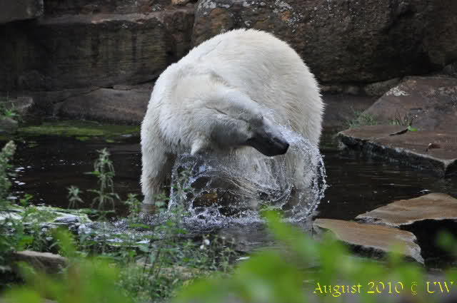 Dann gingen wir wieder zu Knut. Der war endlich erwacht. Das Fell war auch hübsch gefärbt, halb weiß, halb dunkelgrau. So konnte man sich dem Publikum präsentieren. Die Besucher riefen, Knut solle ins Wasser gehen. Zum Glück macht er immer noch, was er will. Aber nachdem er eine Weile mit den Tatzen im Wasser geplanscht hatte, ging er dann doch ganz hinein.