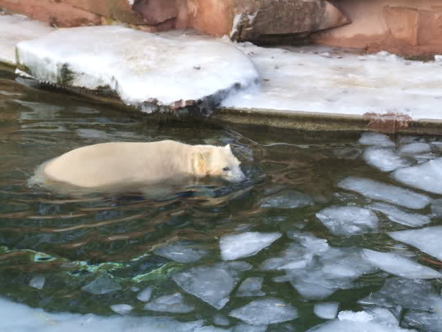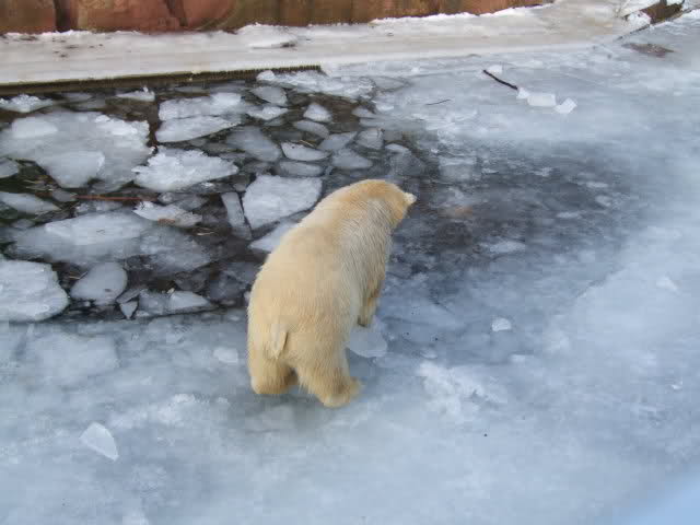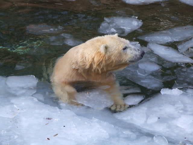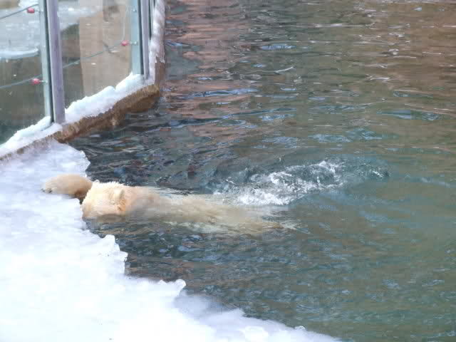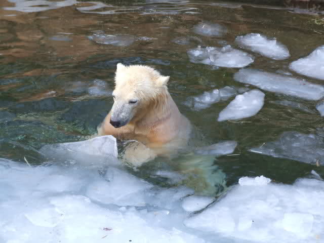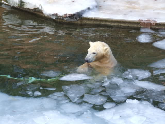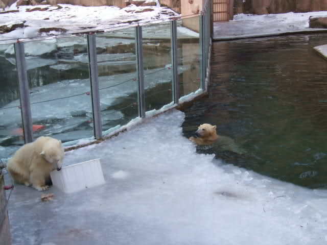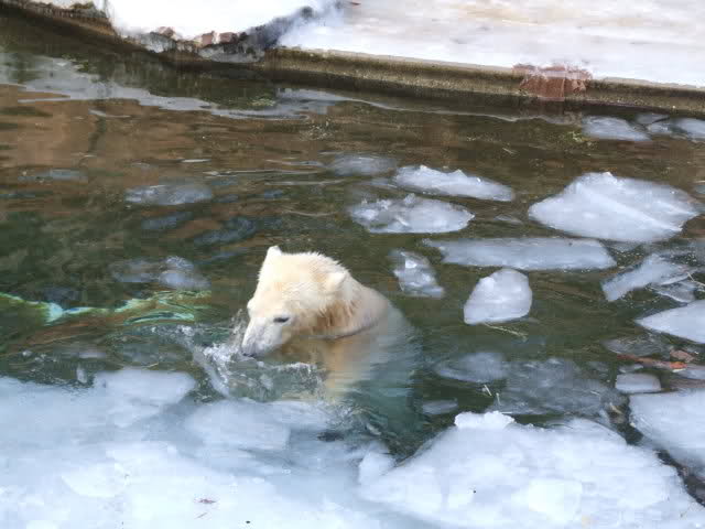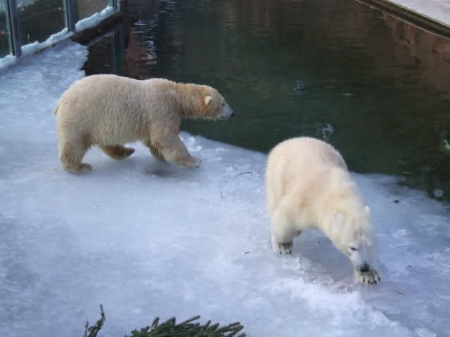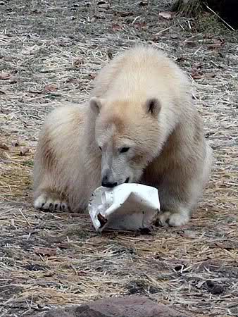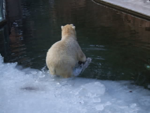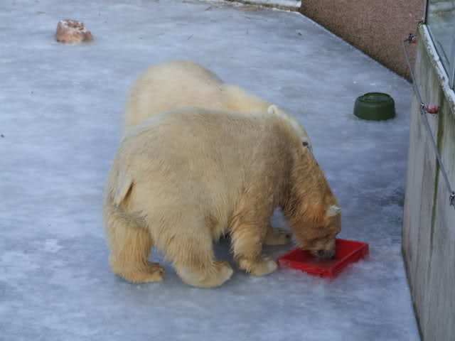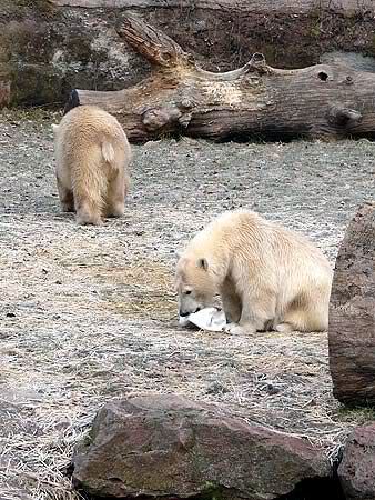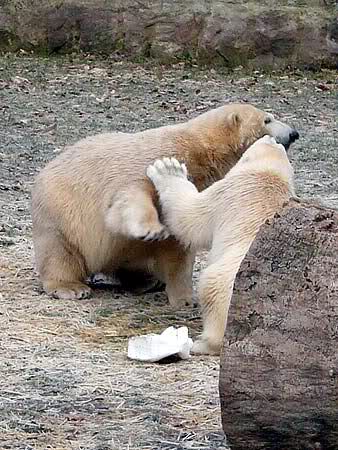 1:0 also im Eisbärengehege. Doch dann lässt Flocke von dem ersten Eimer ab und macht sich an einen zweiten heran. Sichtlich genießt sie es, auf dem alten Plastik herumzukauen, ihre Außenwelt hat sie ganz vergessen. Das ist die Chance für den kleinen Russen: Diesmal stürzt er sich ohne Ankündigung auf die völlig gedankenverlorene Flocke und jagt ihr den Eimer ab. Der Ausgleich, 1:1. Doch anstatt nun selbst mit dem Eimer zu spielen, wirft Rasputin seine Eroberung einfach in den Pool und macht sich von dannen.